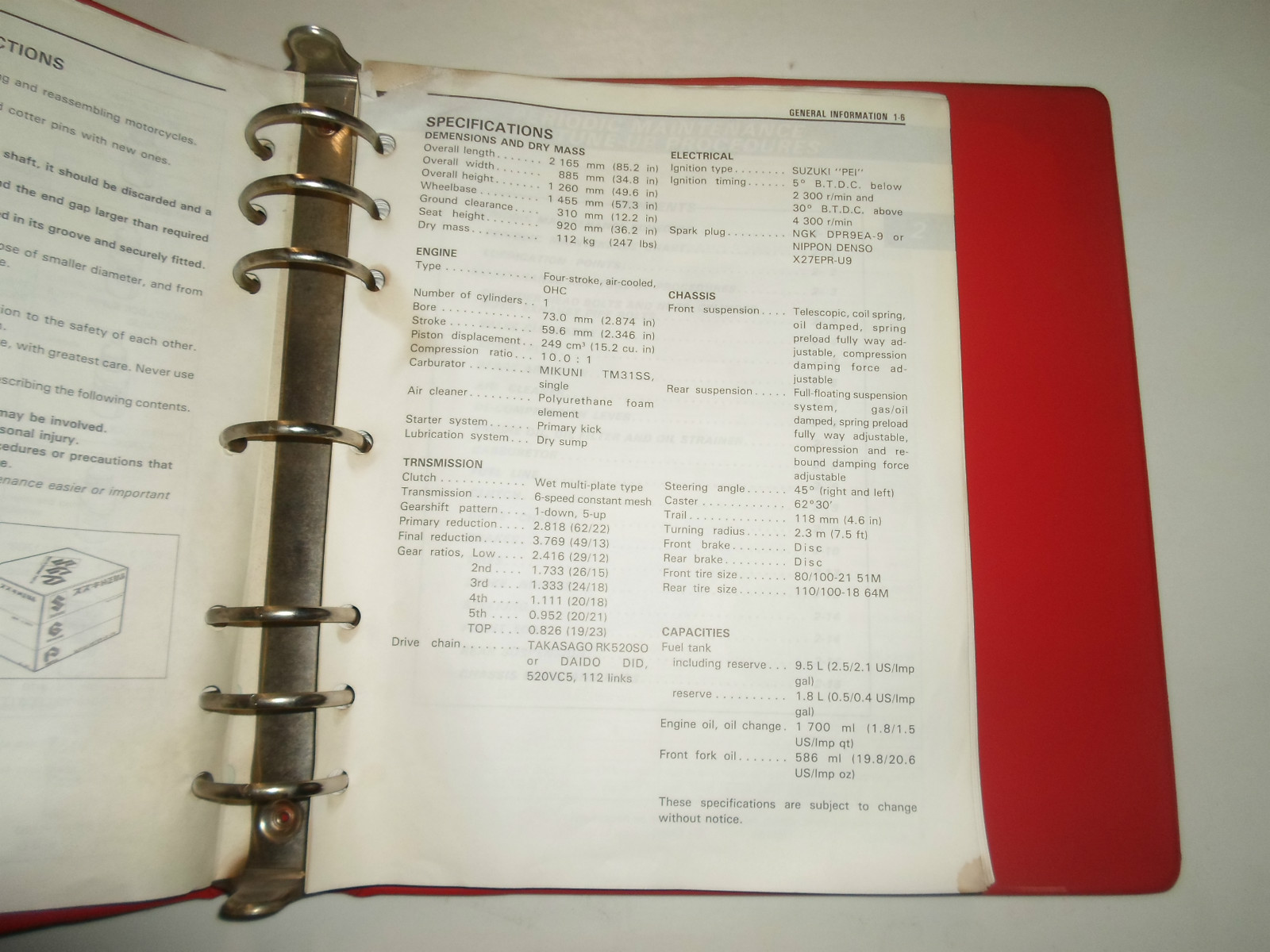 Informativo con illustrazioni, copre molto, istruzioni graduali, assemblaggio/disassemblaggio, illustrazioni/diagrammi esplosioni/risoluzione dei problemi, ottimo manuale da avere quando possiedi un DR250/s e manterra la tua Suzuki sulla strada. Questo manuale ti fara risparmiare denaro in riparazioni/servizio.