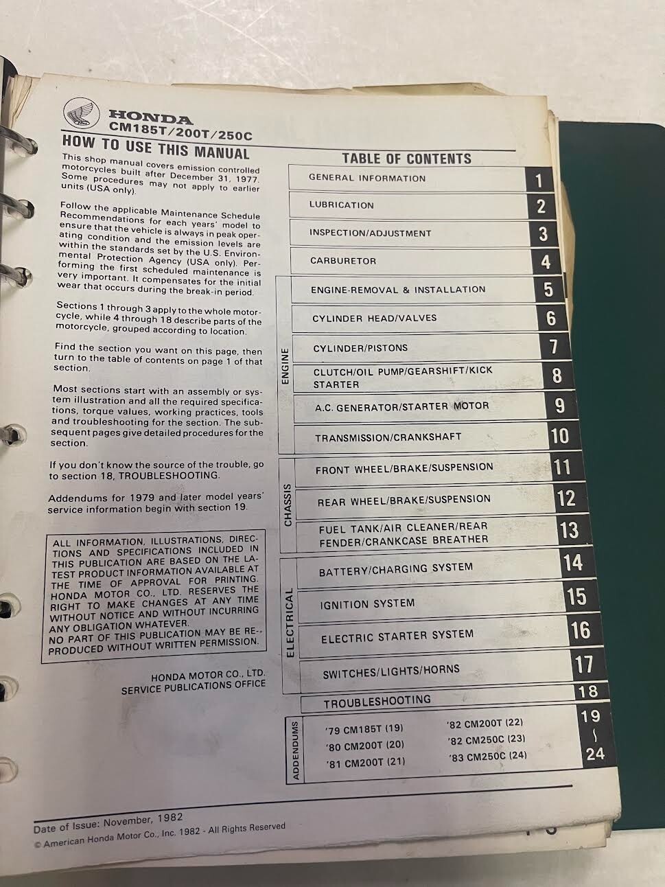 1978-1979 CM185T/1980-1982 CM200T/1982-1983 CM250C Manuale di servizio Honda con il legante e le pagine del bollettino