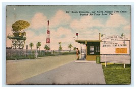 This linen postcard depicts the south entrance to the Air Force Missile Test Center at Patrick Air Force Base in Florida. The image captures the security gate and signage marking the facility, set against a backdrop of palm trees and clear skies typical of the region. Patrick Air Force Base has historically served as a key site for missile testing and space-related military operations, reflecting the strategic importance of the area during the mid-20th century.