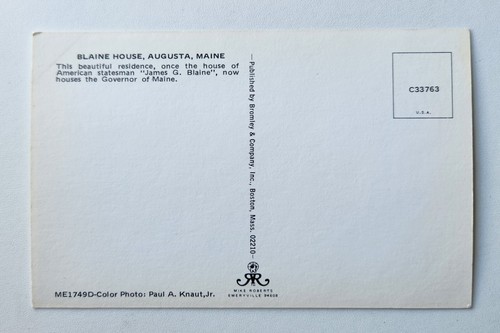 Vintage Divided Back Chrome Postcard Featuring the Blaine House Once Owned by James G. Blaine Now Used as Goveror Mansion Located in Augusta Maine.