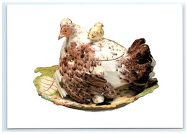 This postcard features an image of a soup tureen and stand decorated with a classic chicken motif, produced by the Chelsea Lawrence Street Factory. The design reflects traditional craftsmanship with detailed artwork showcasing the chicken, a popular decorative theme in vintage ceramics. The tureen and stand exemplify the factory?s attention to quality and style, representing a charming example of historical tableware. The postcard captures the elegance and nostalgic appeal of this collectible kitchenware piece.