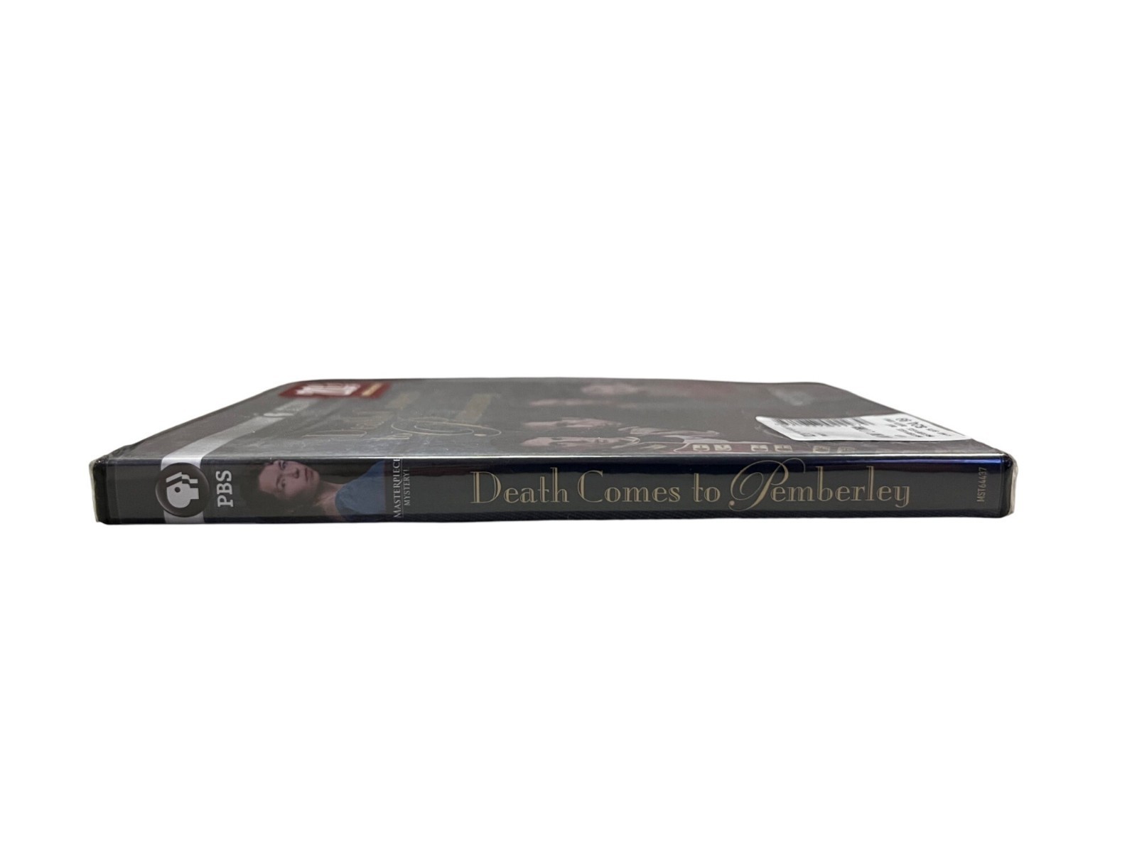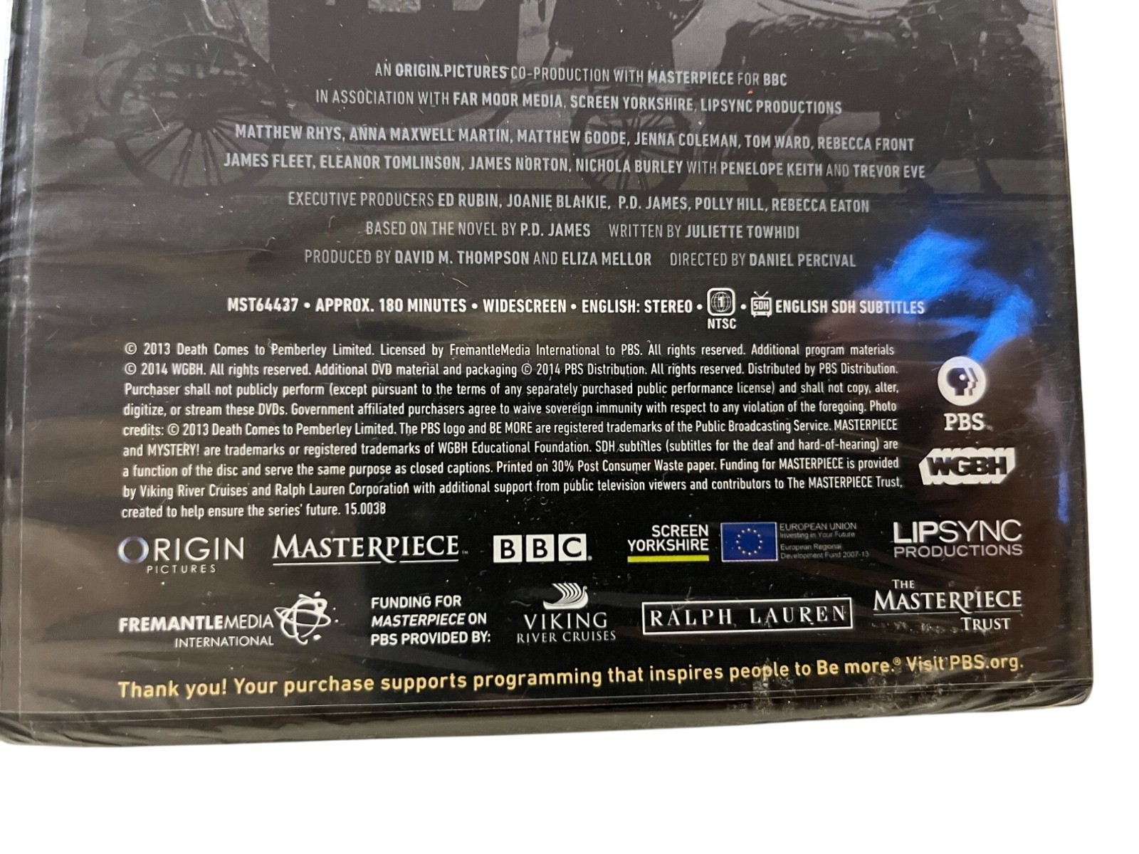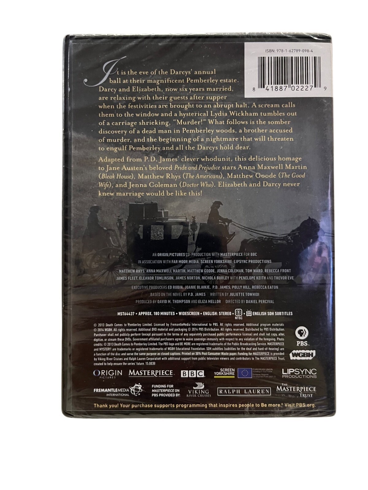 Death Comes to Pemberley DVD, PBS Masterpiece Mystery DVD, 2013 Death Comes to Pemberley, Matthew Rhys DVD, Anna Maxwell Martin DVD, Matthew Goode DVD, Jenna Coleman DVD, Jane Austen DVD, P.D. James adaptation DVD, BBC drama DVD, British mystery DVD, UK edition DVD, sealed PBS DVD, new sealed DVD, period drama DVD, FremantleMedia DVD, Origin Pictures DVD, 180 minutes DVD, Pride and Prejudice sequel DVD, PBS series DVD