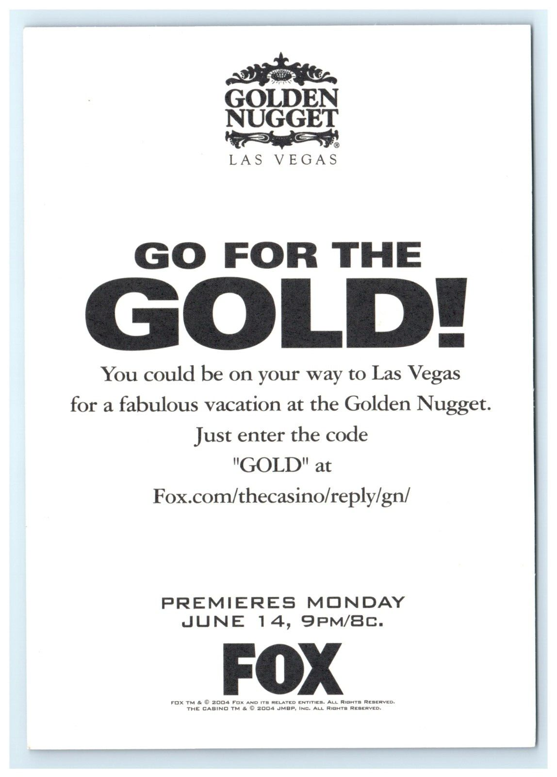 Vintage Advertising Postcard for Fox to Win Vacation to the Golden Nugget in Las Vegas Nevada.