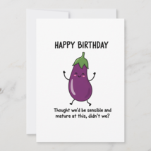 Celebrate another year with a laugh using our Beesonpage funny eggplant birthday card! This unique and quirky greeting card features a cute, smiling eggplant and a relatable message: "Thought we'd be sensible and mature at this, didn't we?". Perfect for friends, family, or anyone who appreciates mature humor and a good chuckle. Our high-quality card is ideal for birthdays, adding a touch of playful charm to your well wishes. Make their special day memorable with this distinctive and humorous design.