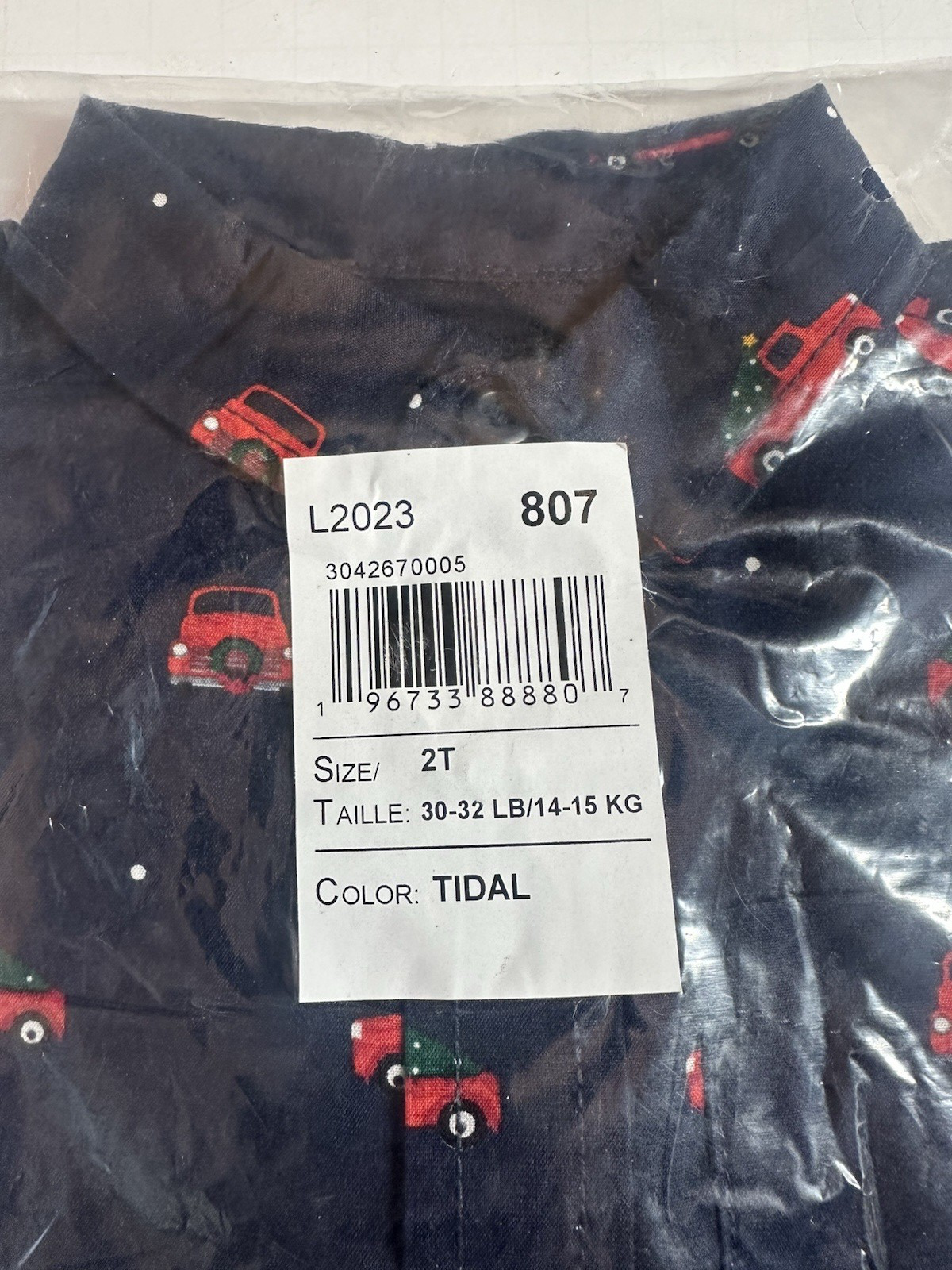 The Children's Place Long Sleeve Button Down Shirt Blue with Red Christmas Truck Print Toddler Boy's Size 2T