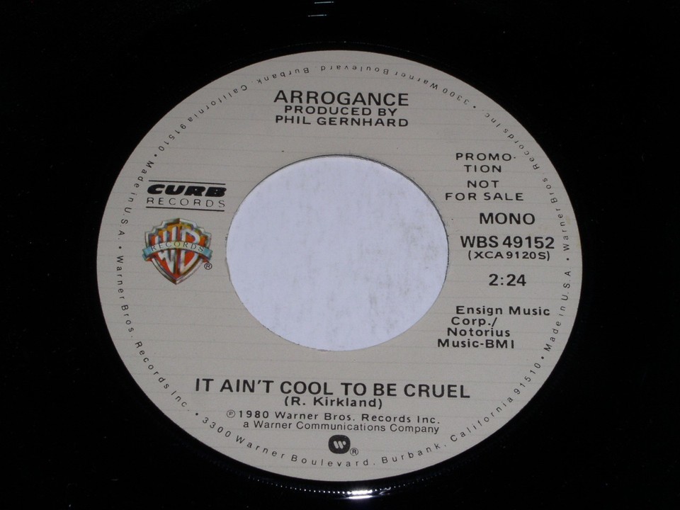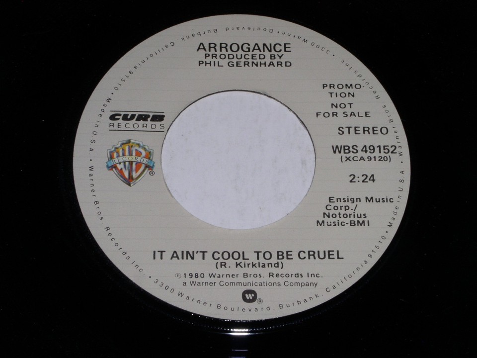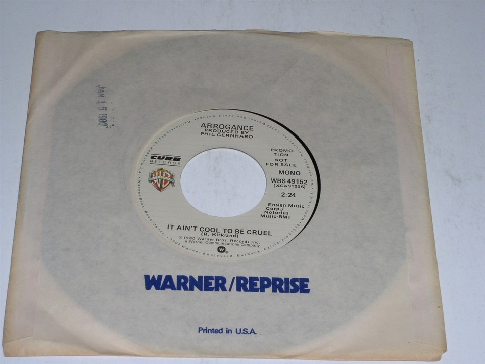 This is the original, vintage 45 rpm phonograph record by the band, Arrogance entitled, "It Ain't Cool To Be Cruel". This is the mono/stereo issue. Record label Curb WBS 49152. Comes with its original W.B. paper sleeve as shown.