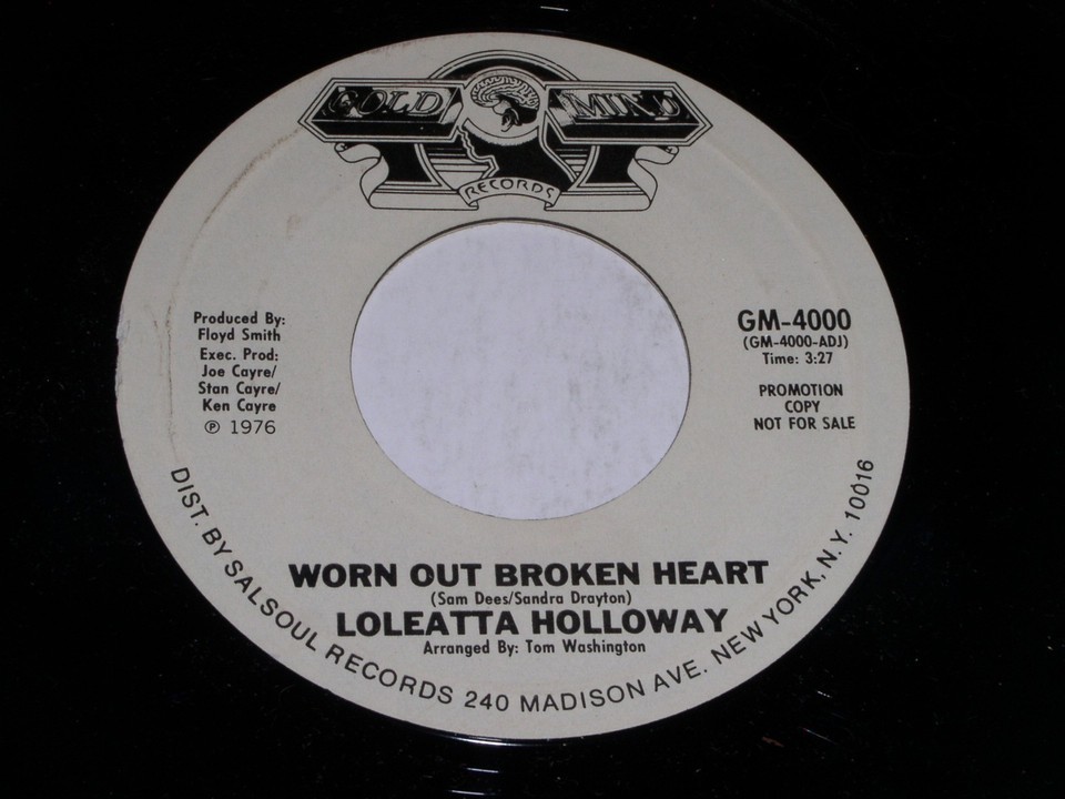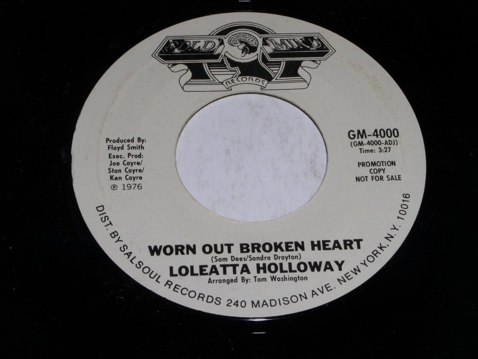 This is the original, rare, vintage white label promotional 45 rpm phonograph record by Loleatta Holloway entitled, "Worn Out Broken Heart". Same flipside. Record label Gold Mind GM-4000.