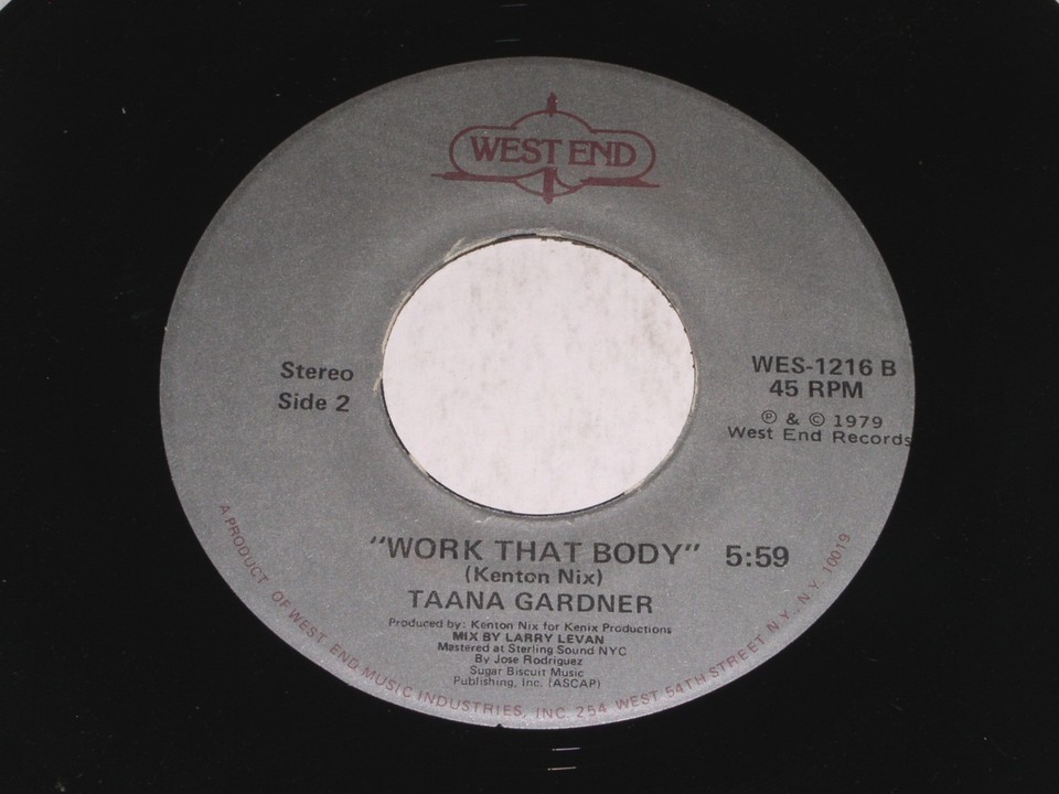 This is the original, vintage 45 rpm phonograph record by Taana Gardner entitled, "Work That Body". This is the long/short issue. Record label West End WES-1216.