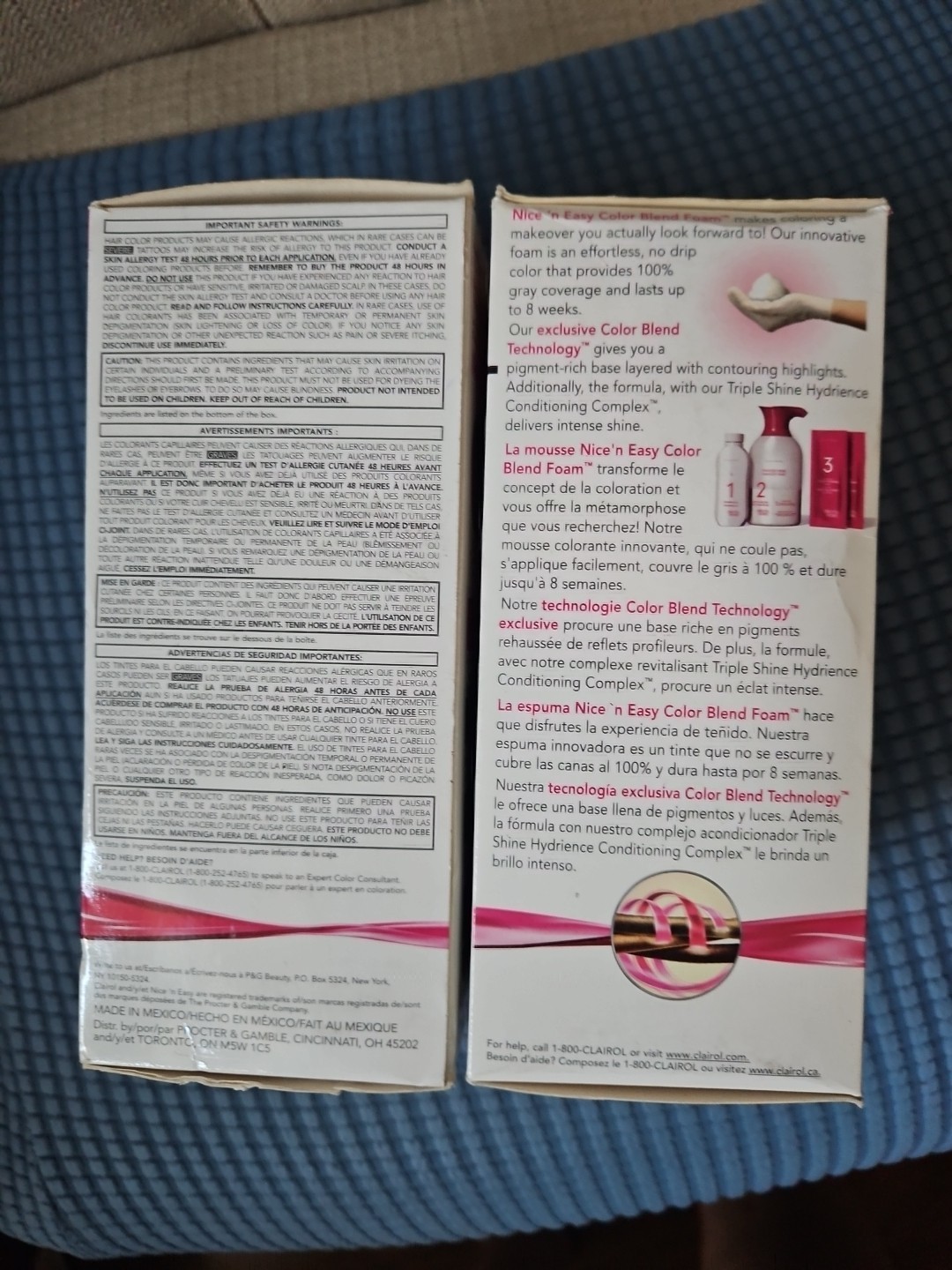 Clairol Nice 'N Easy Permanent Hair Color 8A/106 Natural Medium Ash Blonde x4![]() ![]() ![]() ![]() ![]() I used my first box of hair color the other morning. When I added the color formula to the activator bottle, I could see swirls of the activator in the bottle and no matter how hard I shook, it would not mix. I even poured it into a cup to see if I could get it to mix using a spoon. When in the bottle, while trying to apply to scalp, there were thick chunks that would clog up the nozzle making it impossible to apply. I managed to get enough solution out to touch up the grey roots but a lot of the solution was poured down the drain due to being too thick. I don't know what caused this but something had compromised this box.