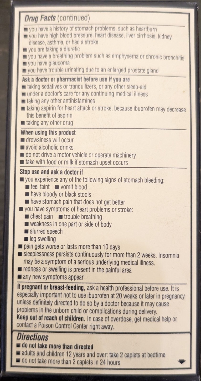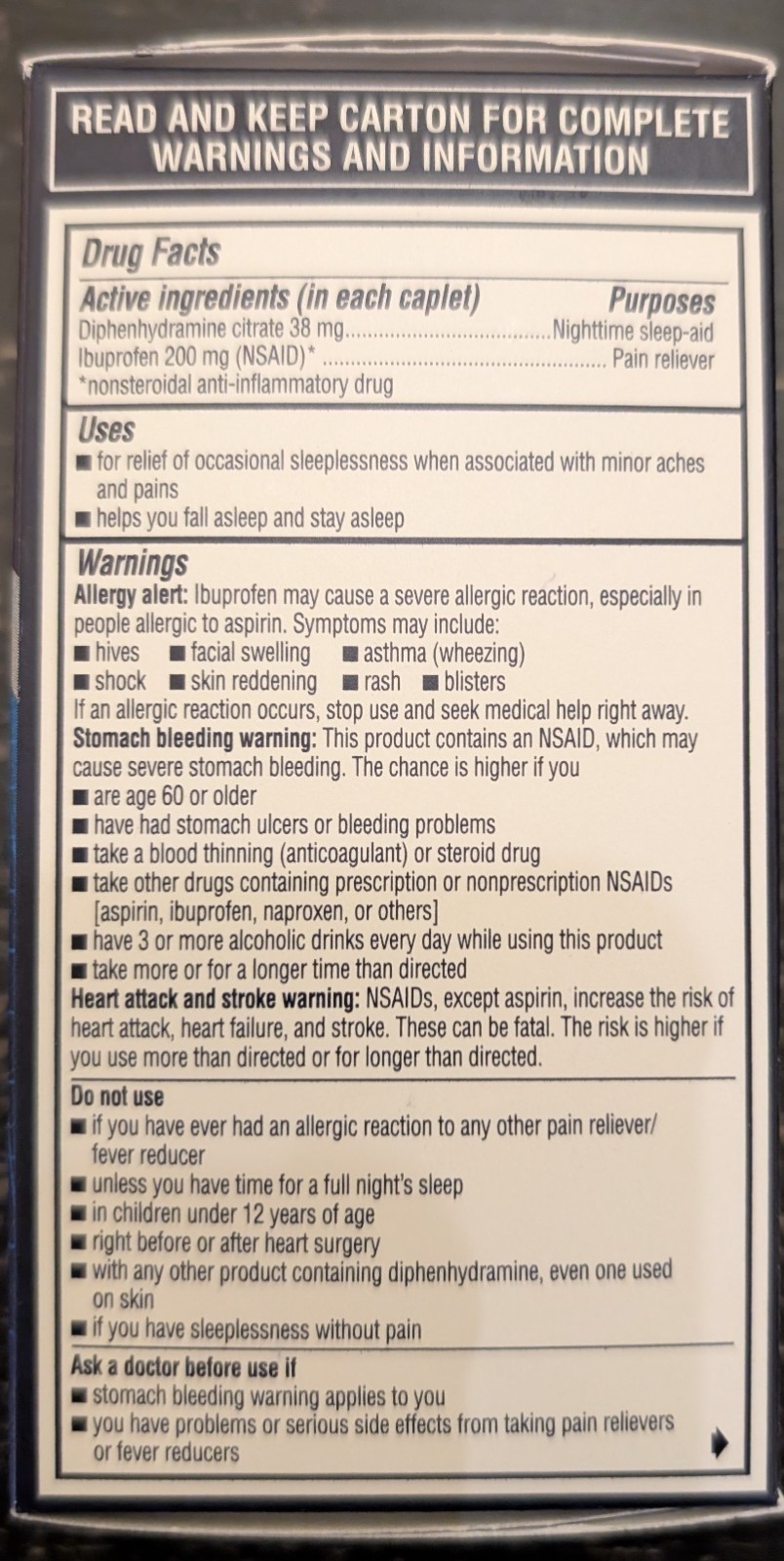 Advil PM, Ibuprofen 200mg/Diphenhydramine citrate, 38mg, Pain reliever(NSAID)/Nighttime Sleep-Aid. 200 Coated Caplets