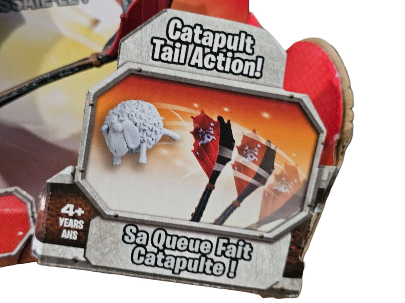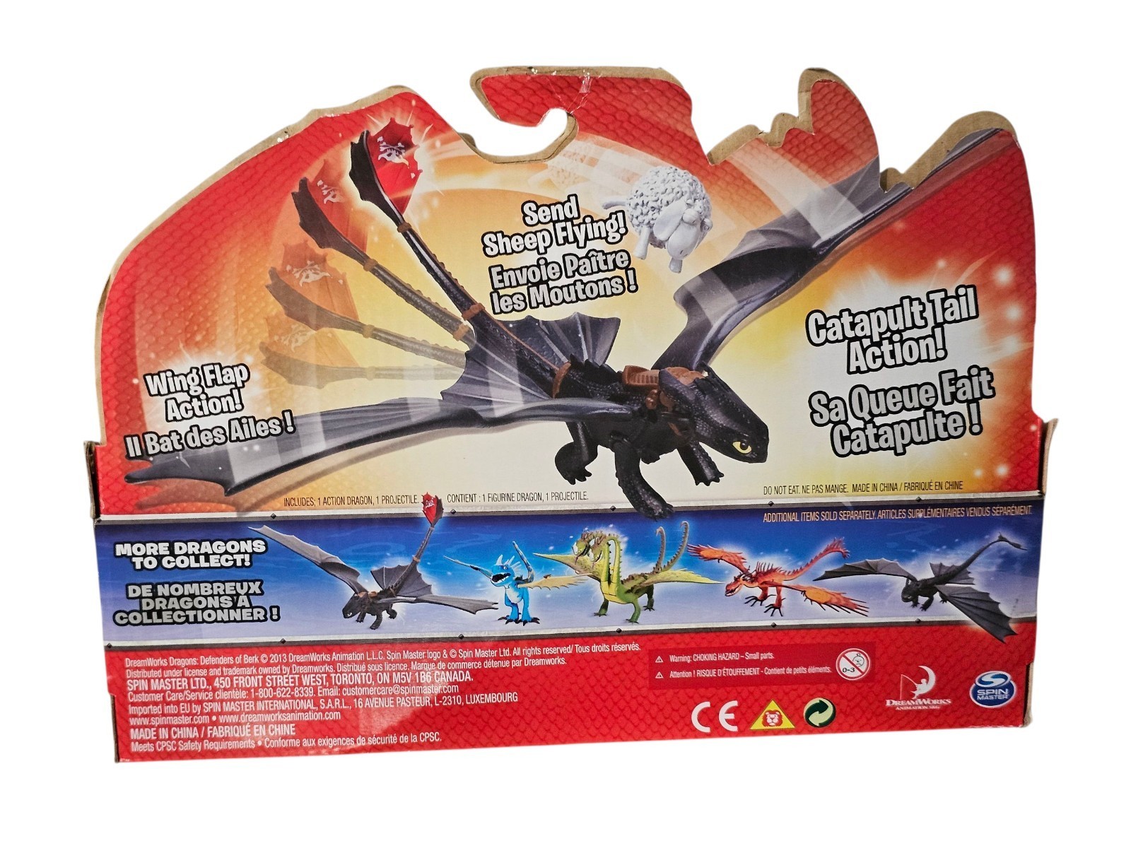 Box has some minor damage at front of the box. The product is a rare action dragon figure of Toothless from the movie "How to Train Your Dragon," released in 2013. It features an adjustable catapult tail and comes with a sheep accessory. This unisex toy, suitable for fans of all ages, is an original licensed reproduction from DreamWorks Animation and Spin Master. The black plastic figure is based on the animated dragon character Toothless, making it a must-have for collectors and fans of the franchise.