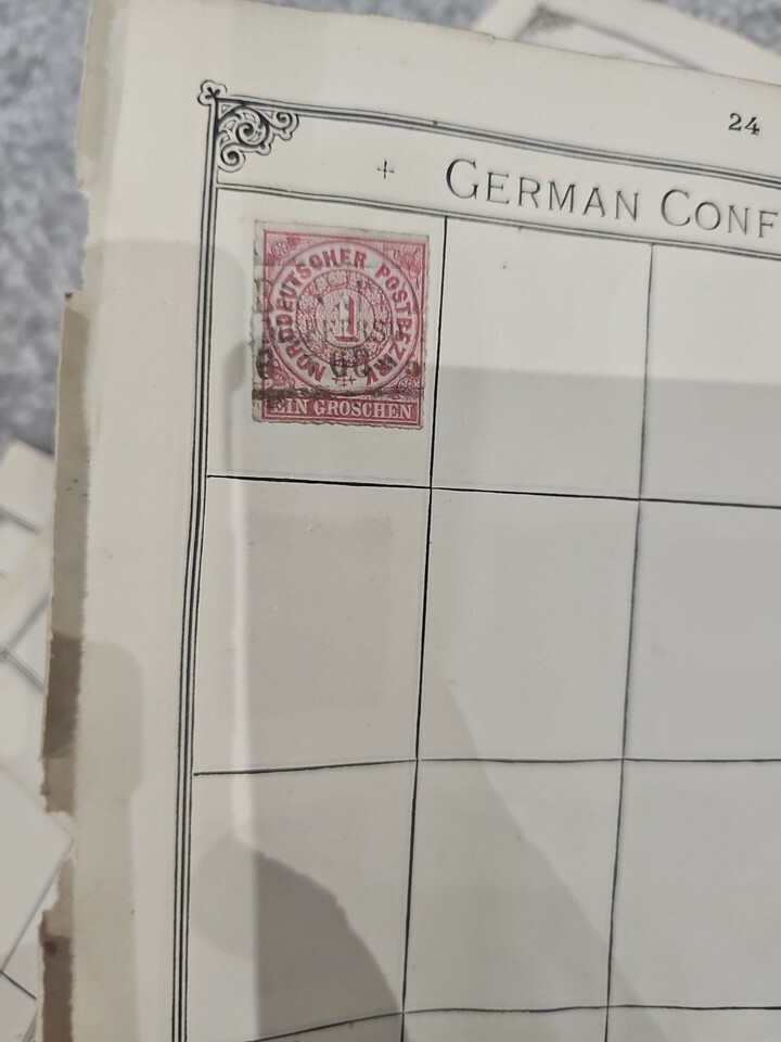 An attractive collection of 7 original vintage album pages featuring classic German states and early German Empire stamps (Deutsches Reich). Includes rare and sought-after regional issues from the mid-to-late 1800s.