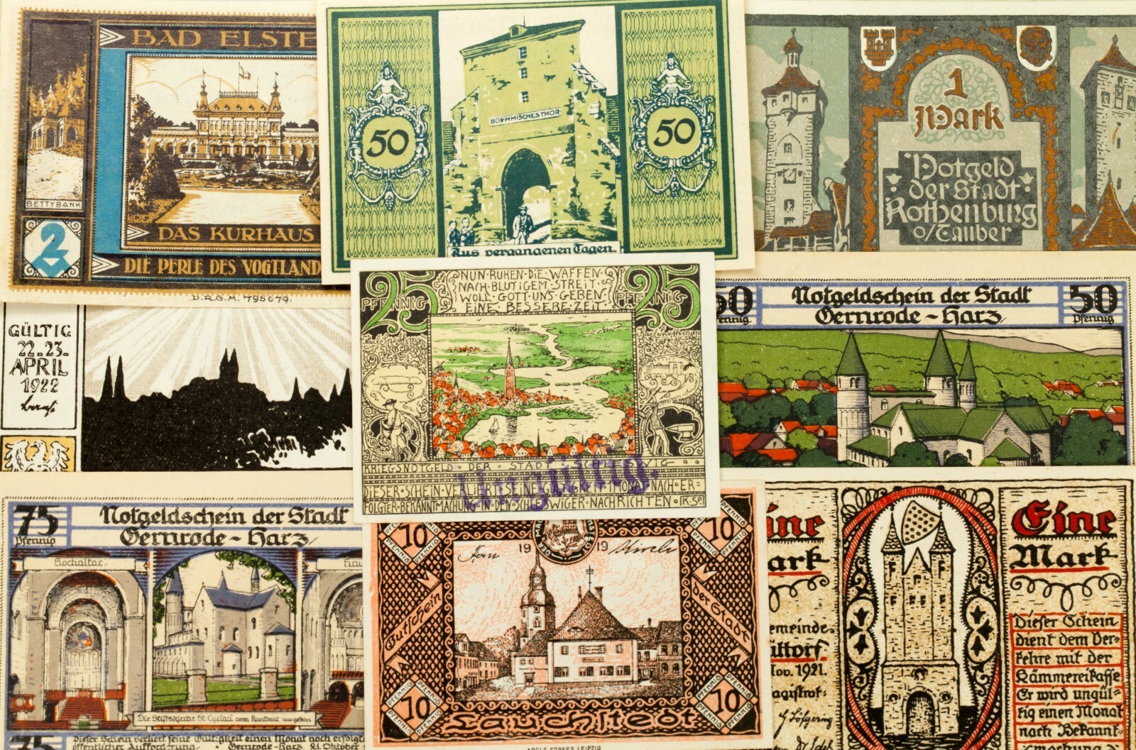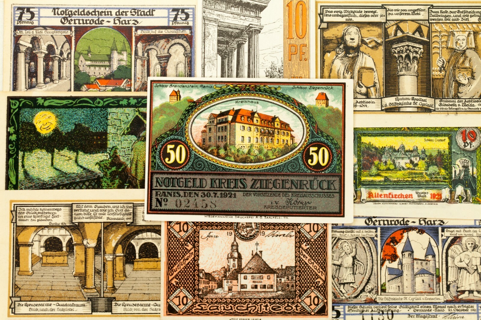 Ce lot comprendra 25 notes de notgeld individuelles d'Allemagne apres la Premiere Guerre mondiale. Valeurs faciales entre 5 pfennig a 5 marque. Visites de la ville, monuments, paysages et theme des chateaux, pas de doublons.