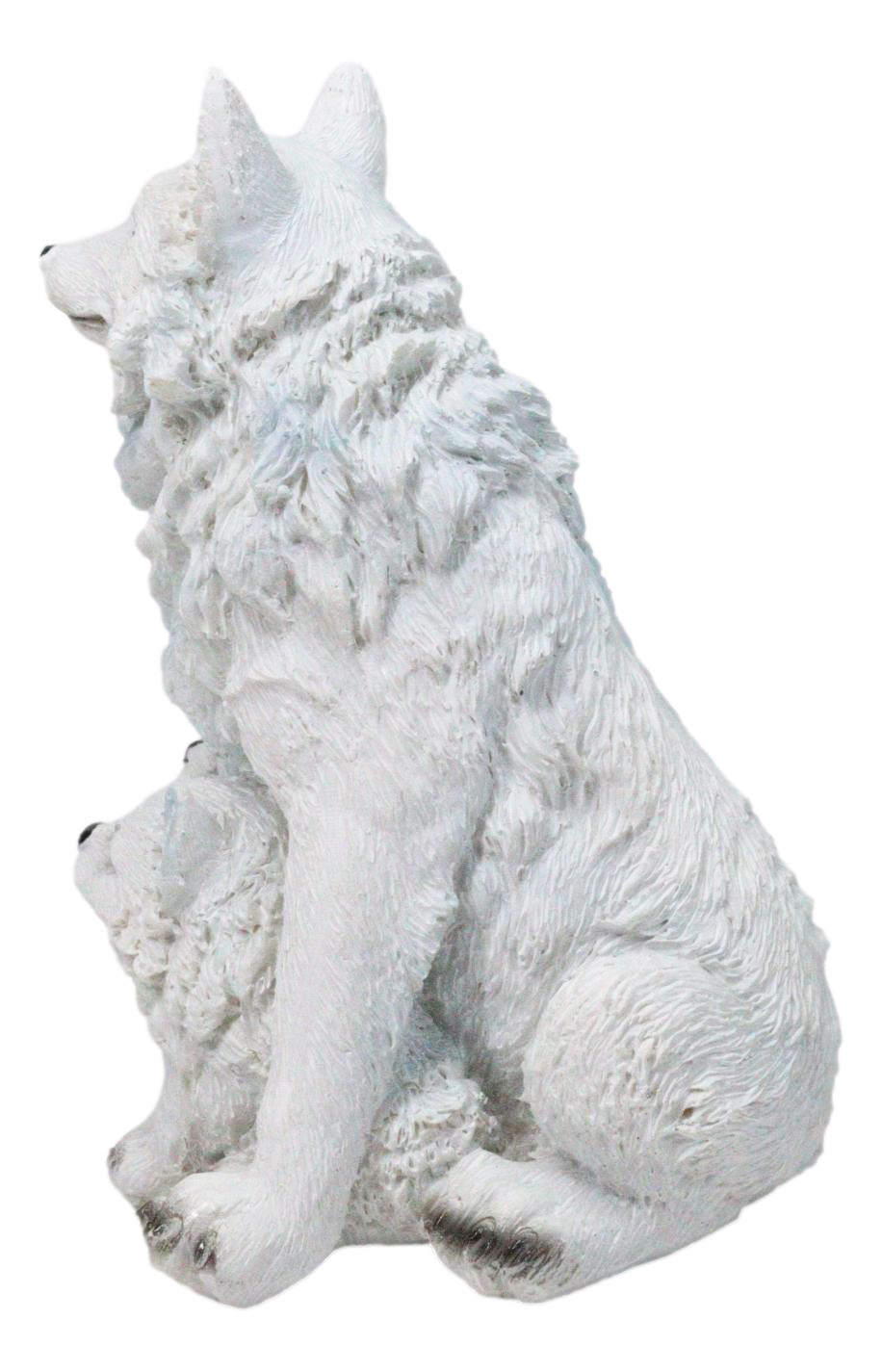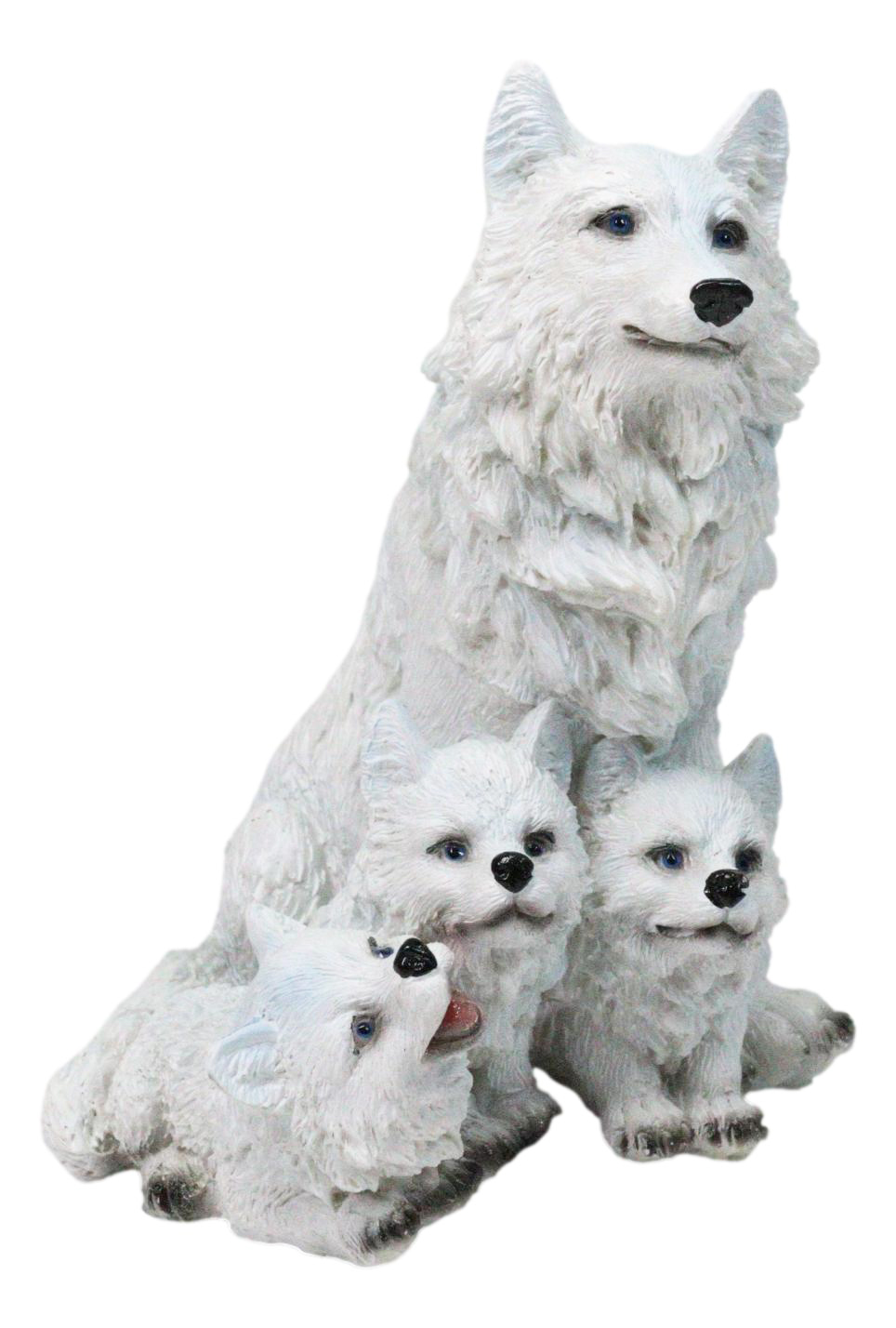 Winter Snow White Wolf Mother Sitting with 3 Adorable Cubs Family Figurine Decor
