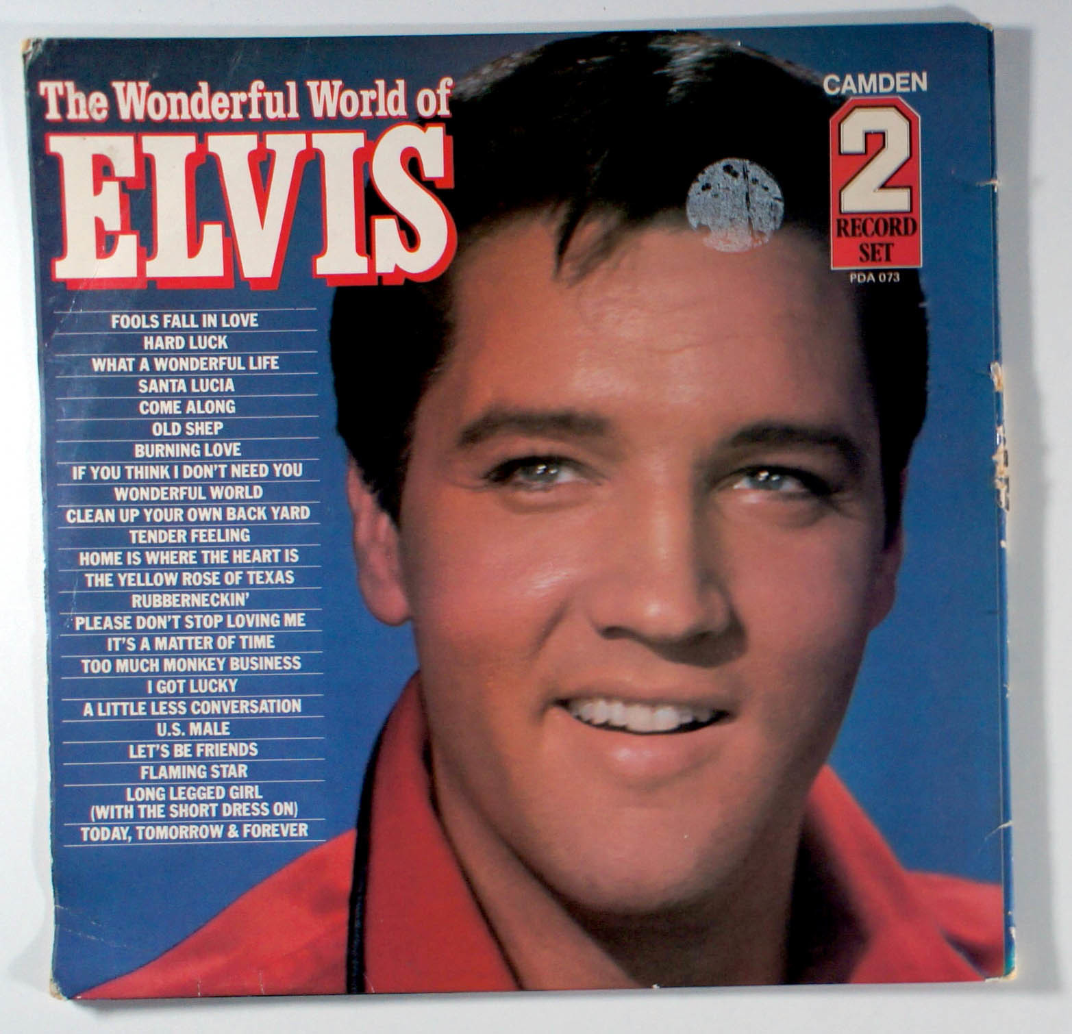 The Wonderful World Of Elvis is a double vinyl compilation album by Elvis Presley, released in the UK on the Camden label in 1981, with earlier versions appearing as early as 1978 on St. Michael, serving as part of "The Elvis Collection" series to showcase his diverse recordings from the 1960s and early 1970s. The gatefold sleeve features extensive liner notes explaining the background and musicians for each track, including credits like producer Felton Jarvis on Fools Fall In Love and Burning Love, and notable session players such as James Burton, Jerry Reed, and Boots Randolph across songs spanning rock, country, and pop styles. Tracks range from covers like Too Much Monkey Business (Chuck Berry) and Santa Lucia (arranged by Presley himself) to originals such as Hard Luck and Rubberneckin, highlighting his vocal versatility and piano playing on Old Shep. Historically, this album reflects Presley's post-Army output during a period of film soundtracks and sporadic hits, compiling lesser-known cuts alongside fan favorites without achieving major chart success itself, contributing to the ongoing repackaging of his catalog for international markets. Among the tracks, hit singles include Burning Love (his last major US Top 10 hit in 1972) and A Little Less Conversation (a 1968 single that gained renewed popularity via a 2002 remix), while others like Flaming Star (1960 title track) and Rubberneckin (1969 Top 20) add to its appeal for collectors.