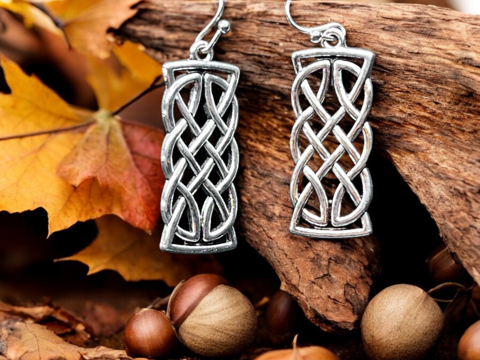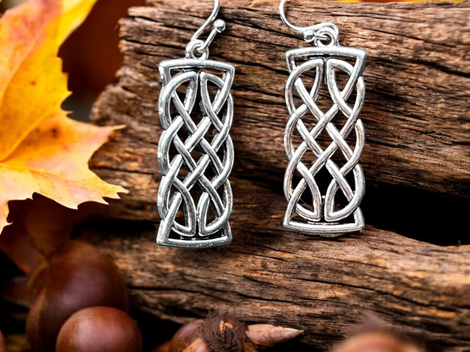 Add a timeless touch with these Celtic Knot Rectangle Earrings in a vintage silver tone. The detailed woven design makes them a perfect accessory for boho outfits, festivals, or everyday wear. Ideal gift for lovers of Celtic and tribal-inspired jewelry.