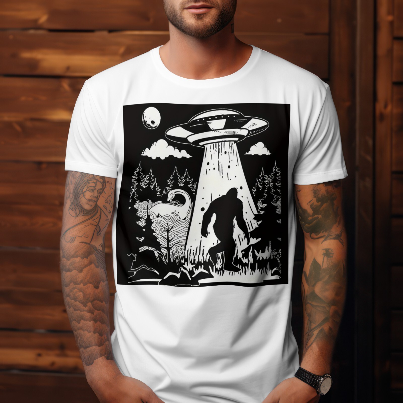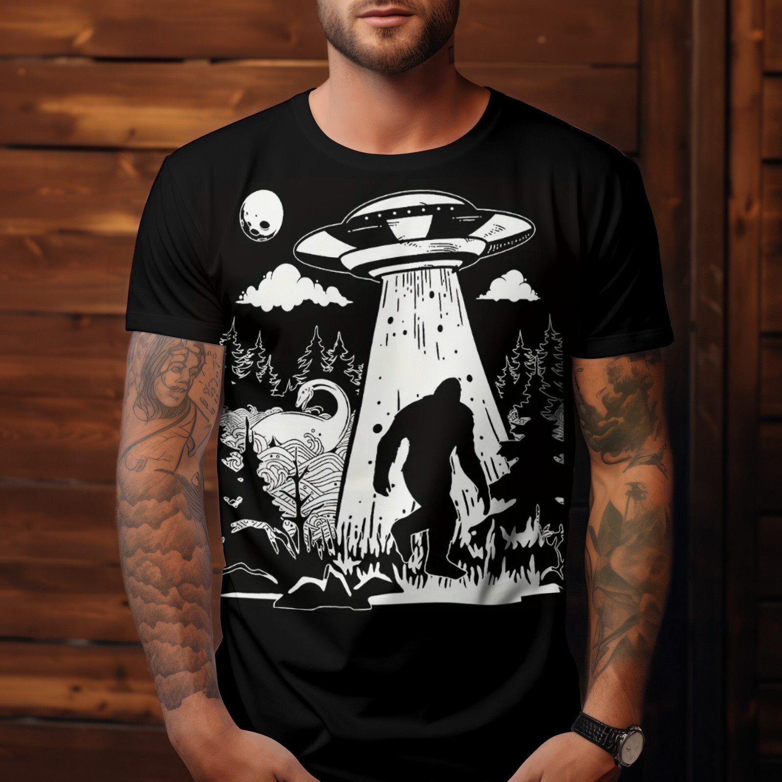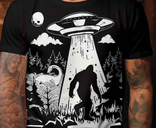 Step into the world of the unexplained with this Bigfoot UFO Abduction T-Shirt, featuring a bold black-and-white forest scene of Sasquatch being abducted by a flying saucer. Includes iconic cryptid details like the Loch Ness Monster, aliens, and a full moon ? perfect for lovers of the paranormal and mysterious.