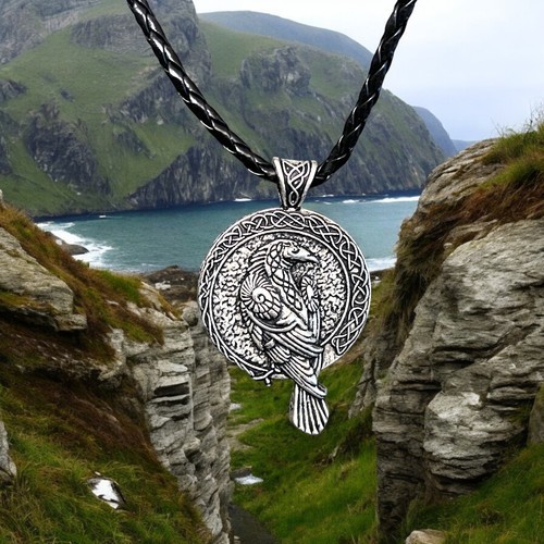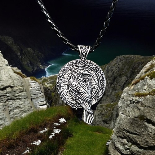 This detailed Norse pendant necklace features a powerful raven, surrounded by intricate Celtic knotwork. The raven, symbolizing wisdom, mystery, and the spirit of Odin, is a significant figure in Norse mythology. Crafted with precision, this pendant is set on a durable braided chain, making it ideal for lovers of Viking culture, pagan symbolism, or Celtic art. A unique accessory that brings a touch of ancient Norse heritage and mystique to any look, perfect as a personal amulet or thoughtful gift.