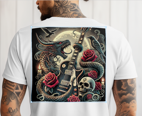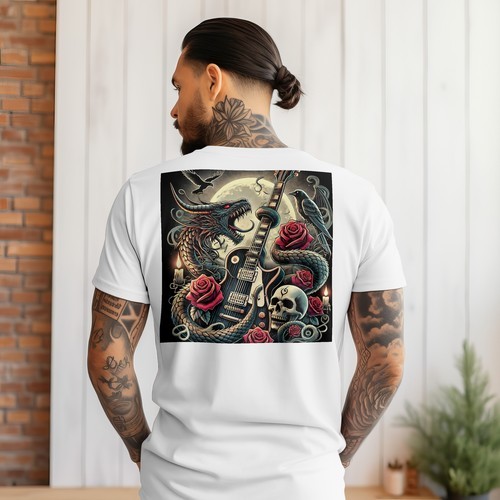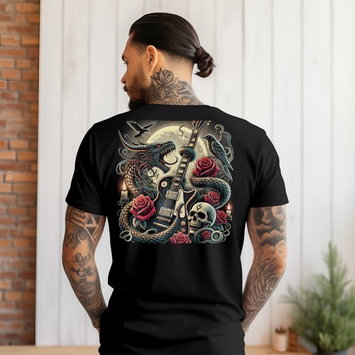 Gothic Rock Guitar T-Shirt | Dragon, Skull, Roses & Candlelight Design | Dark Te