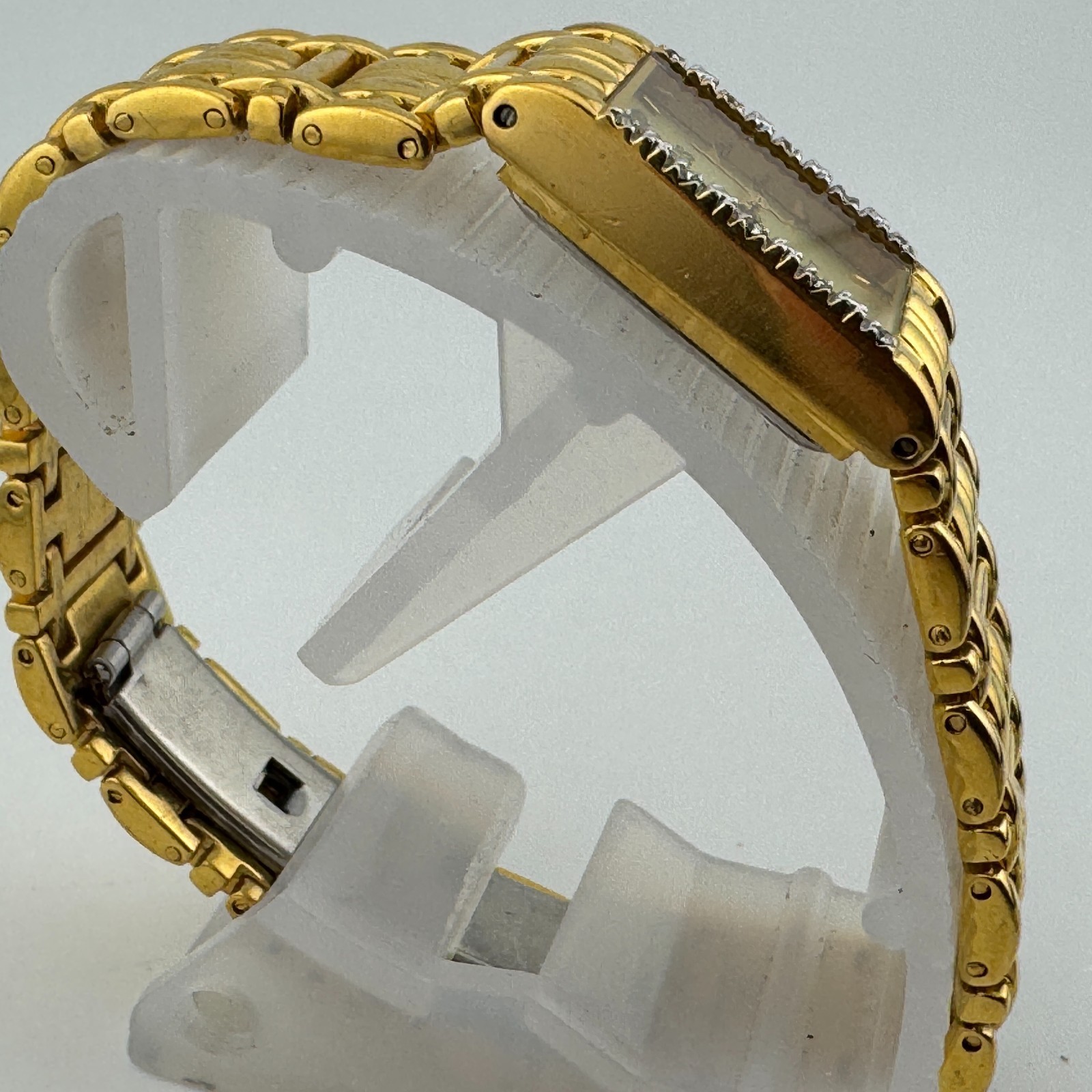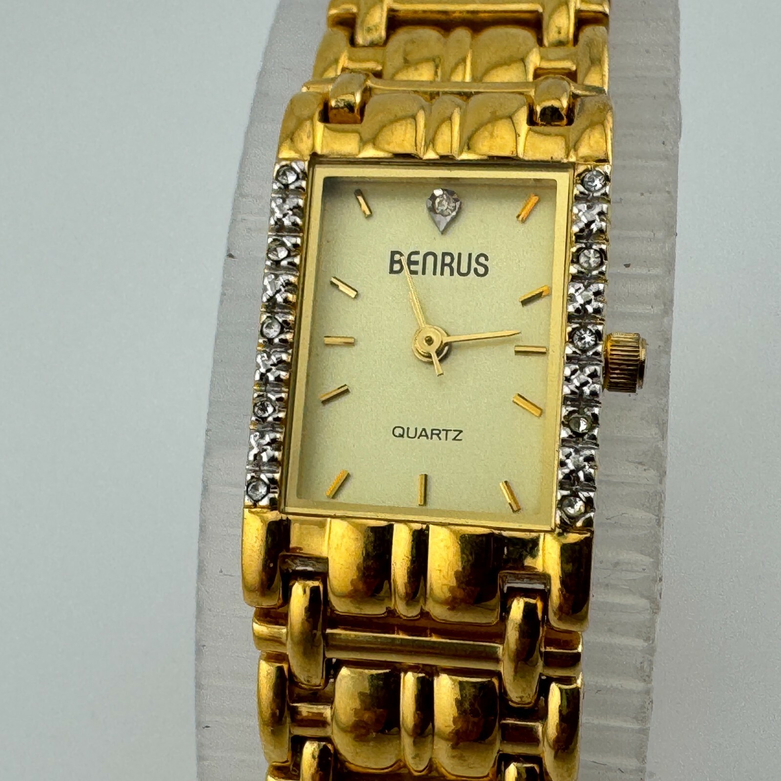 VTG Benrus Quartz Watch Women Real Diamonds Gold Tone Rectangle New Batte 6.75"