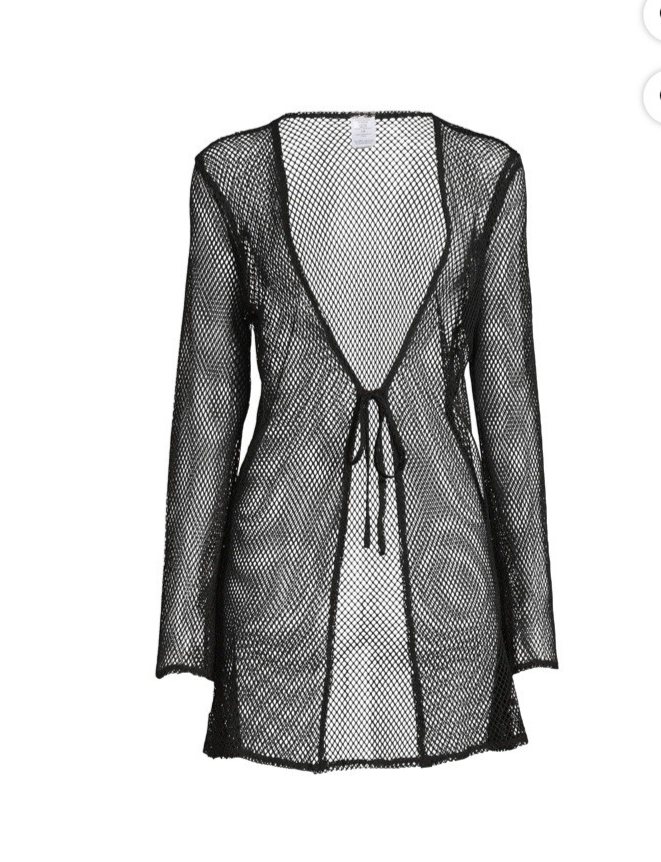 No Boundaries Women's Black Tie Front Side Slit Mesh Long Sleeve Swim Cover Up