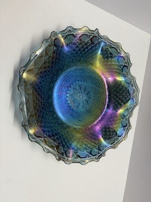 The Vintage Indiana Glass Iridescent Carnival Diamond Flower Tray Dish Bowl is a stunning piece of American-made glass from the mid 20th century. This round bowl features a beautiful diamond point pattern in a vibrant blue color, with a glossy finish that adds to its decorative appeal. The 10" diameter makes it perfect for all occasions, and its carnival glass production style gives it a unique and stylish look. With its vintage charm and Mid-Century Modern style, this bowl is sure to enhance any home decor with its iridescent and decorative features.