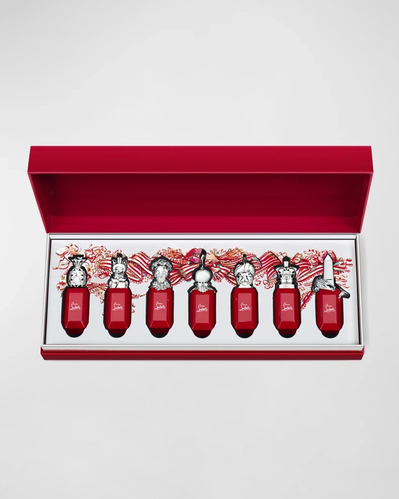 Miniature format, pure magic! The 7 perfectly formed, red-lacquered bottles invite you to enter the Loubiworld of fragrance. Displayed inside a glossy-red, keepsake box adorned with entrancing, customized illustrations, each miniature bottle is crowned with a fantastical heavy metal silver cap, revealing a personal story from the creator. The perfect gift to dive into the immersive universe of Christian Louboutin and the Loubiworld fragrance collection.