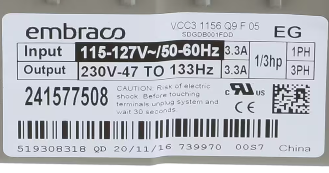 Fits Frigidaire VCC3 1156 Q9 F 05, SDGDB001FDD, 241577508 Invertor, 115-127V