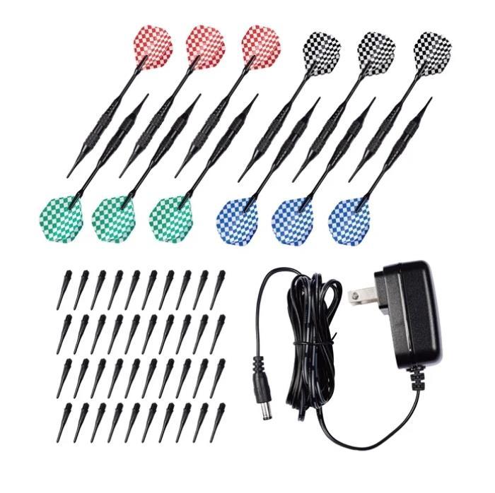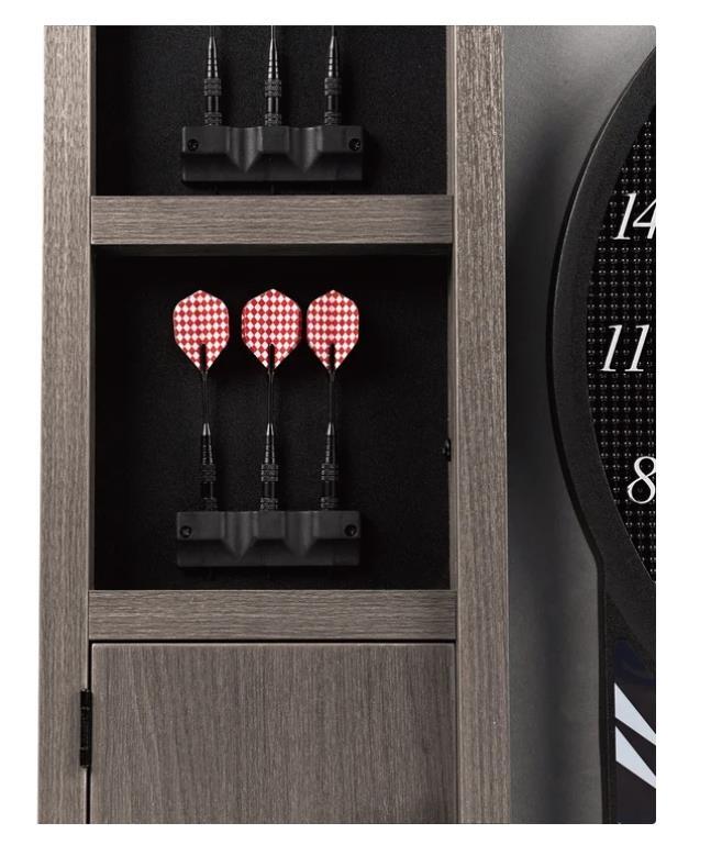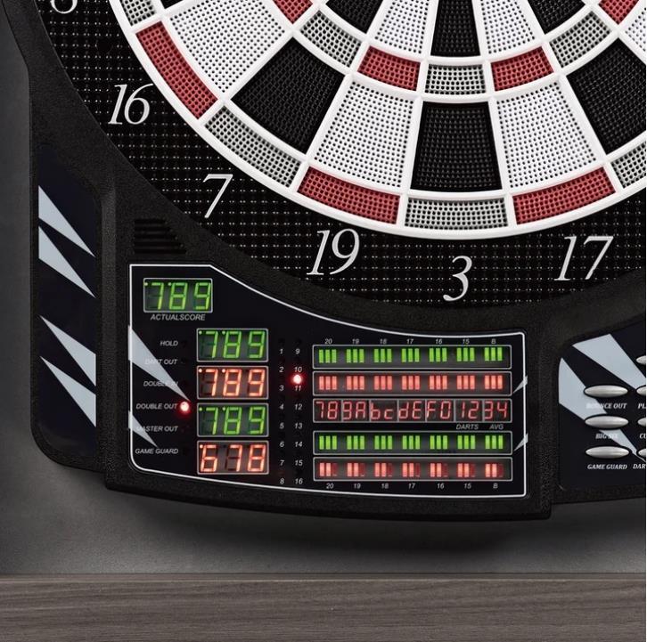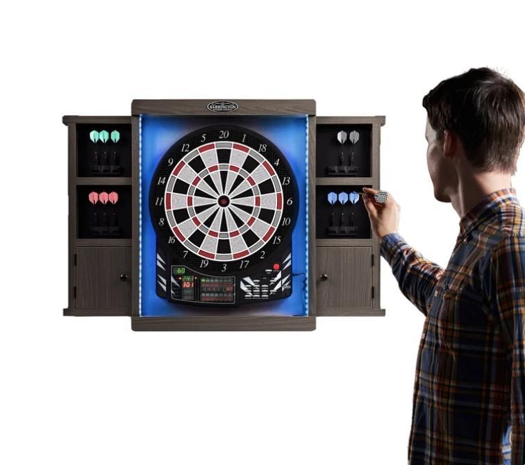 This Barrington Official Size, Soft Tip, Electronic Dartboard with Cabinet is a great indoor game with four LED color options: blue, red, white, and green. This electronic dartboard has 41 different games, 323 variations, and a four-mounted LED scoreboard to keep track of your team's scores. Dart holsters are equipped on both sides of the dartboard and storage compartments with doors built into the cabinet. Complete playing accessories are included with this dartboard cabinet. This Electronic Dartboard is ideal for any get-together with friends and family. With the included mounting hardware, you can easily add to any wall, basement, game room, den, or office for hours of fun.