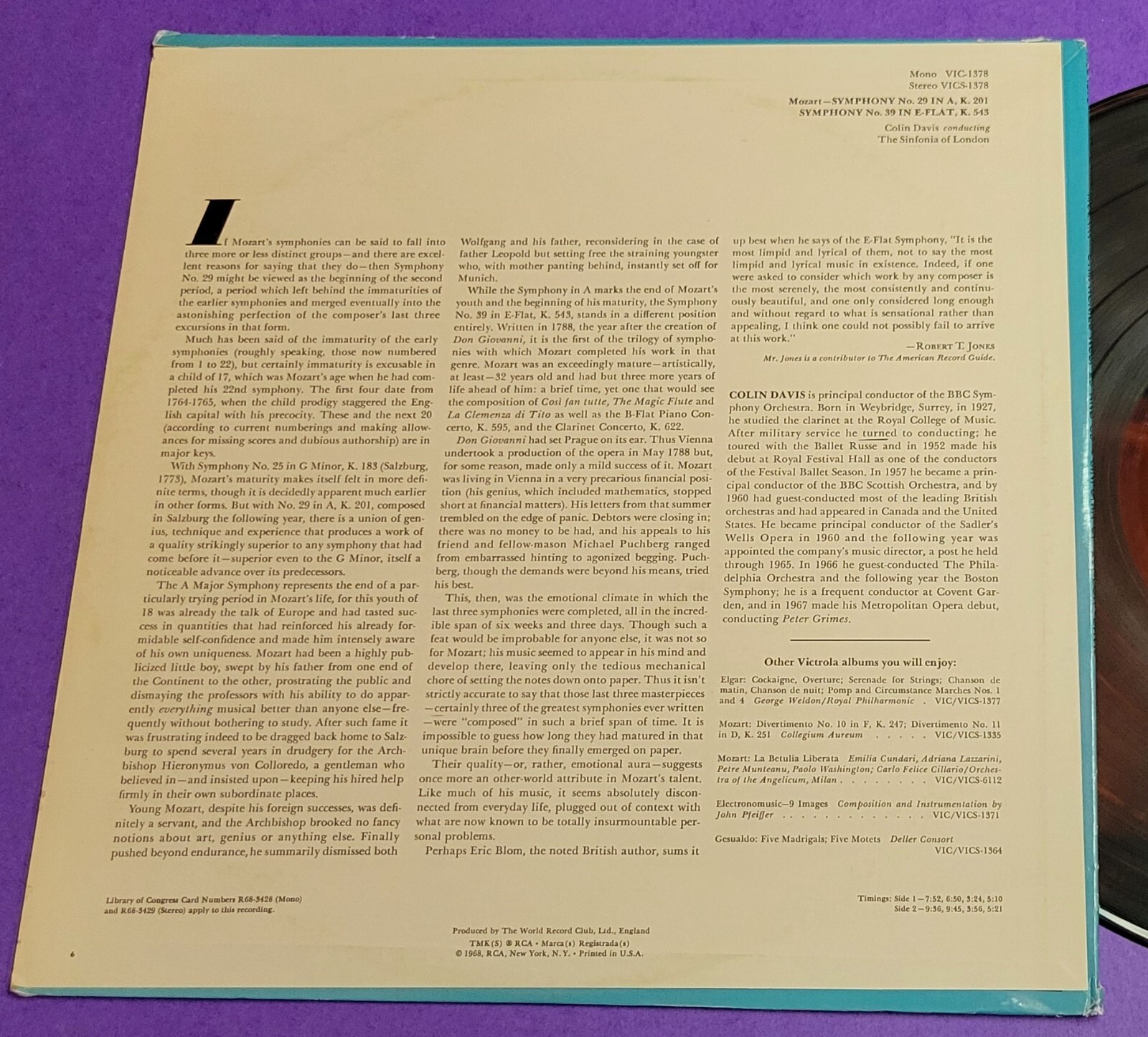 Mozart - Symphony 29 39 - Colin Davis - Victrola - RCA - Vinyl Record