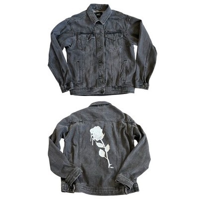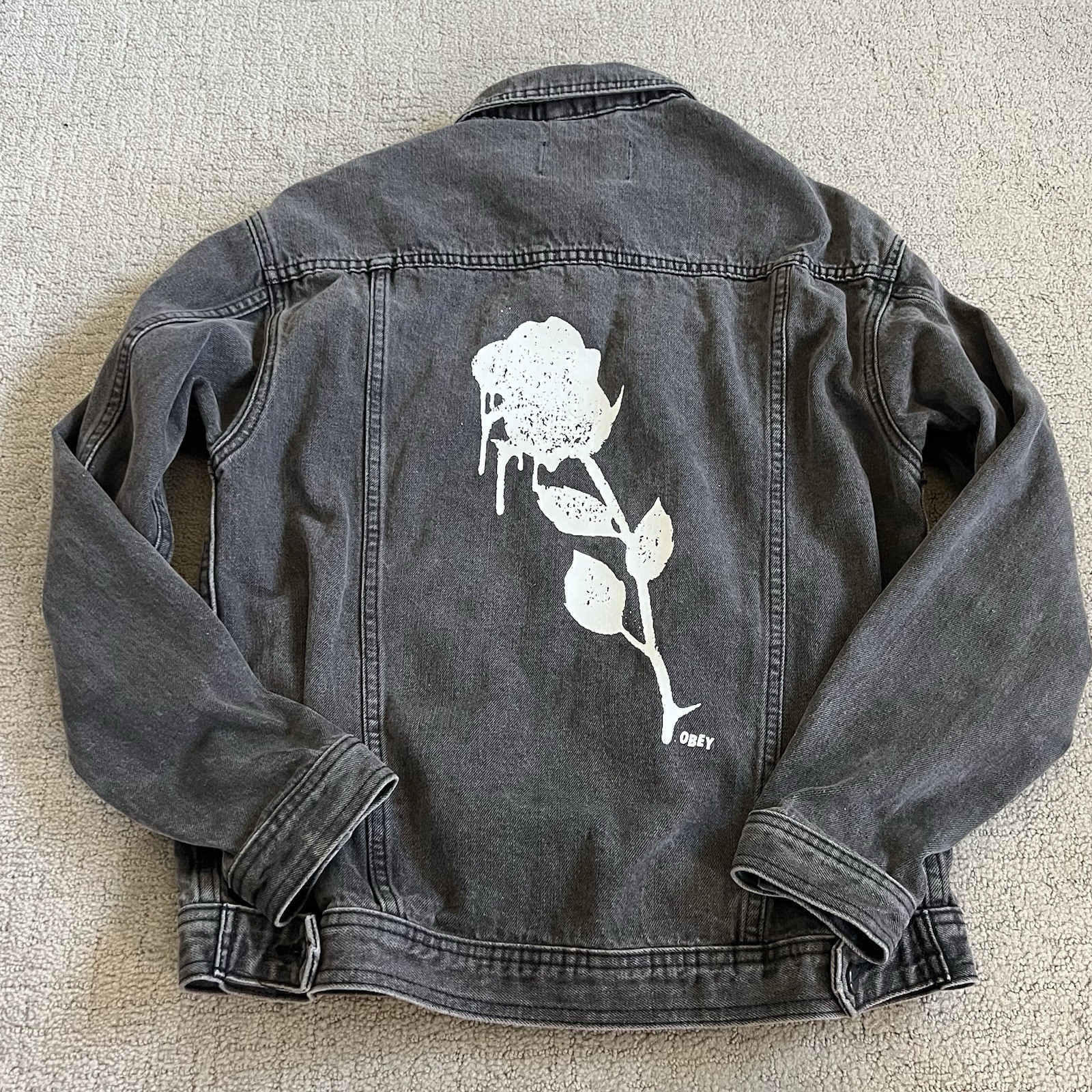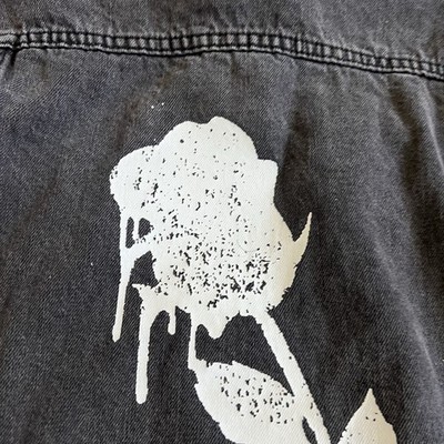 Obey Women?s Jean Trucker Jacket Sz S Faded Black Denim Rose Stencil Graphic GUC