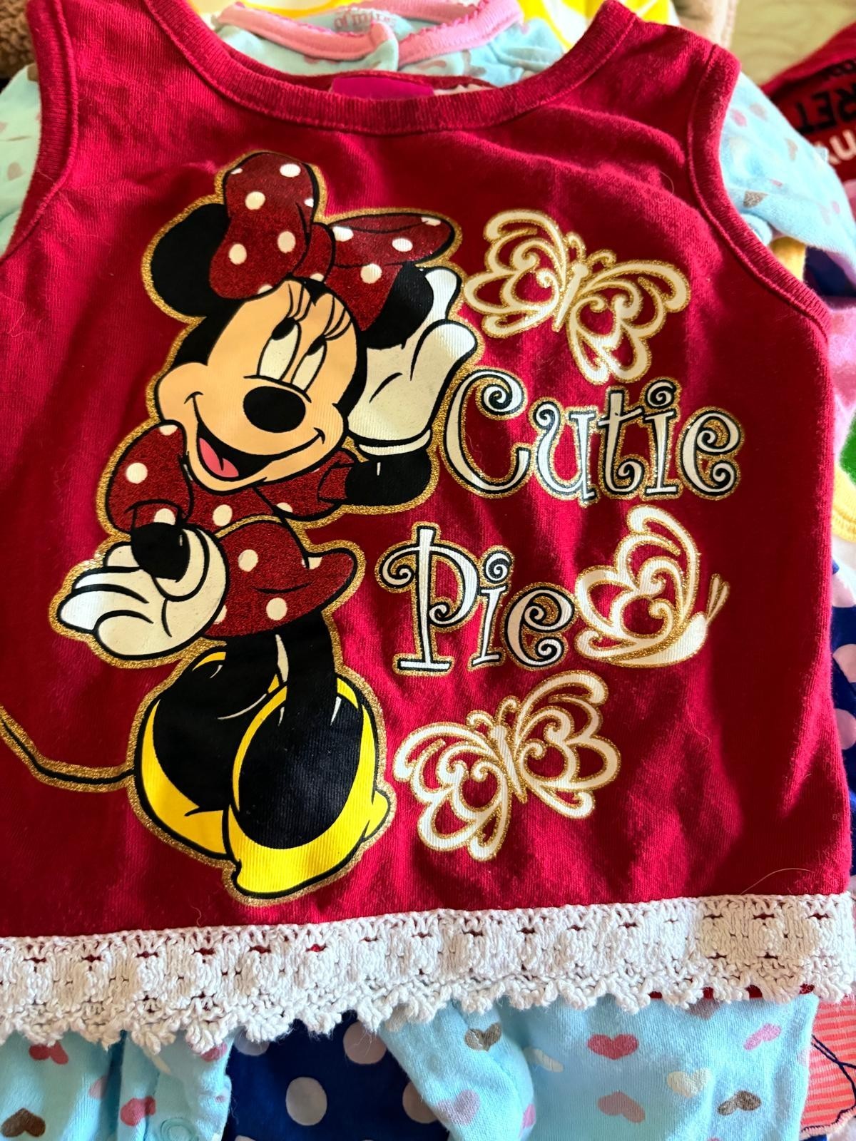 Bright red with Minnie Mouse, butterflies, and "Cutie Pie" graphic