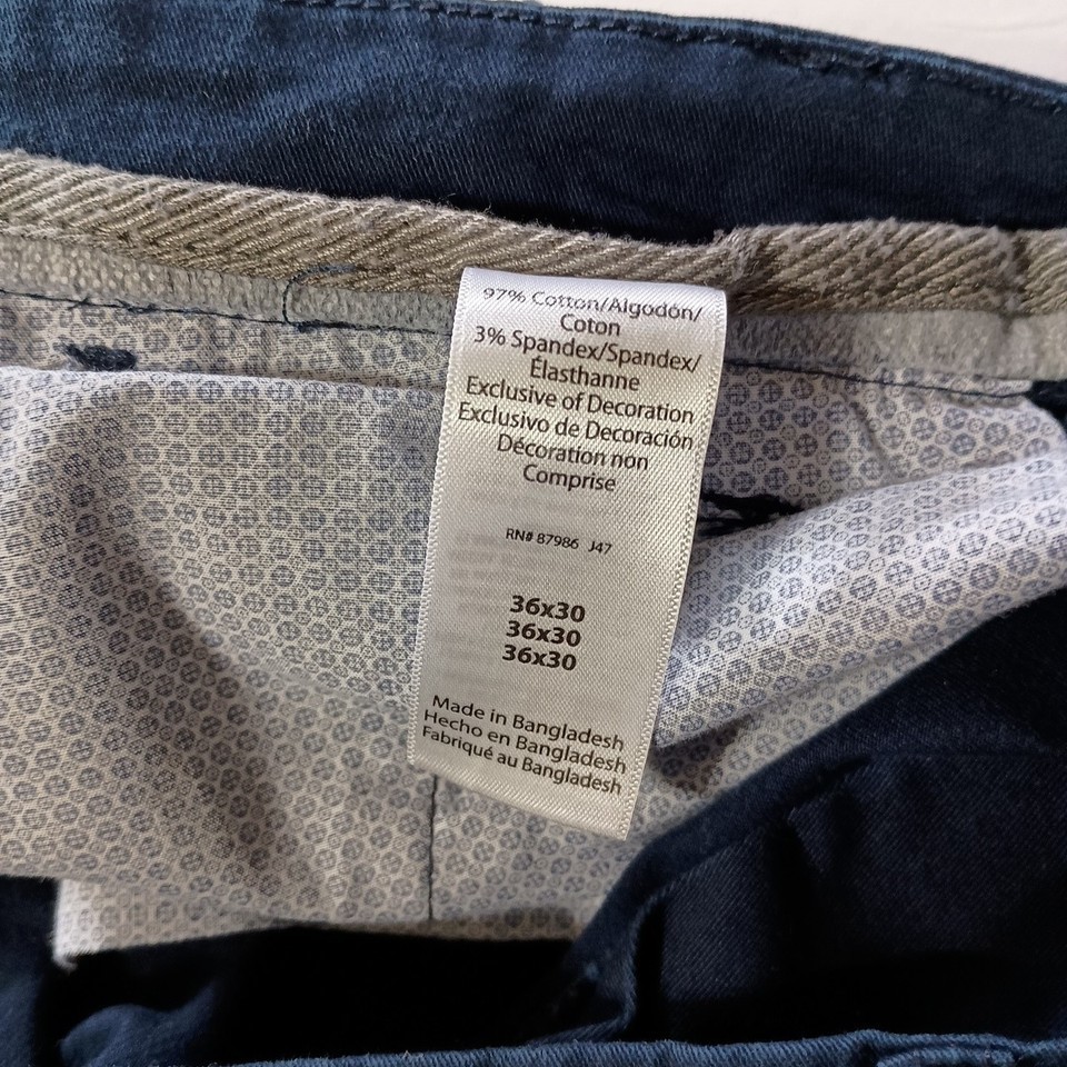 The IKE By Ike Behar Straight Leg Chino Pants in men's size 36x30 are a stylish and versatile option for any wardrobe. Made from a comfortable and stretchy knit fabric blend of spandex and cotton, these pants feature a flat front design with a zip closure and button accents. The mid-rise waist and straight leg fit offer a flattering silhouette suitable for casual, formal, or workwear occasions throughout the seasons of winter, summer, and spring. Easy to care for. Normal wear.