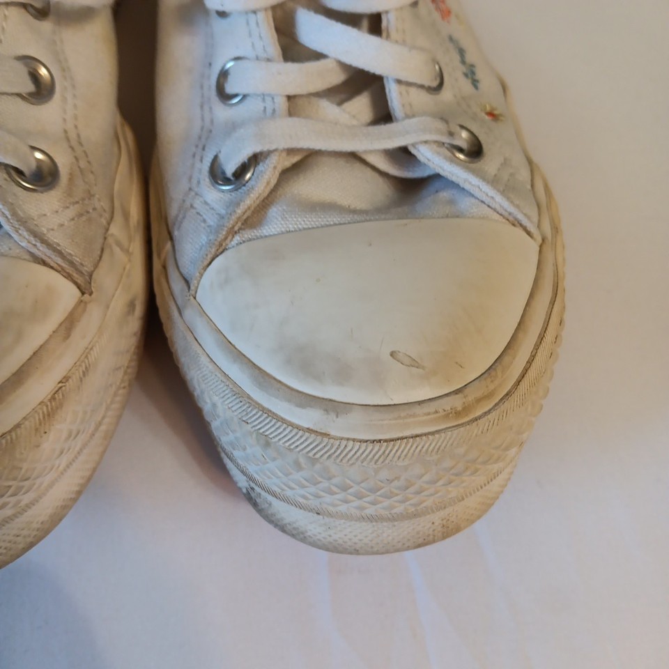 Elevate your sneaker game with these stylish Converse All Star Hi Top Sneakers. The white ivory floral pattern and Y2k theme make them perfect for any trendy person looking to add some unique flair to their wardrobe. The lace-up closure and comfortable features ensure a snug and comfortable fit, while the Converse Chuck Taylor All Star product line and model add a touch of classic style. These sneakers are perfect for any athletic activity or casual day out. Don't miss out on the chance to own these versatile and fashionable shoes! Normal wear. See Pictures.