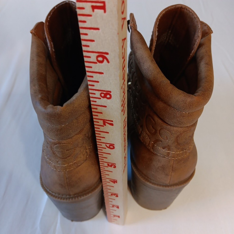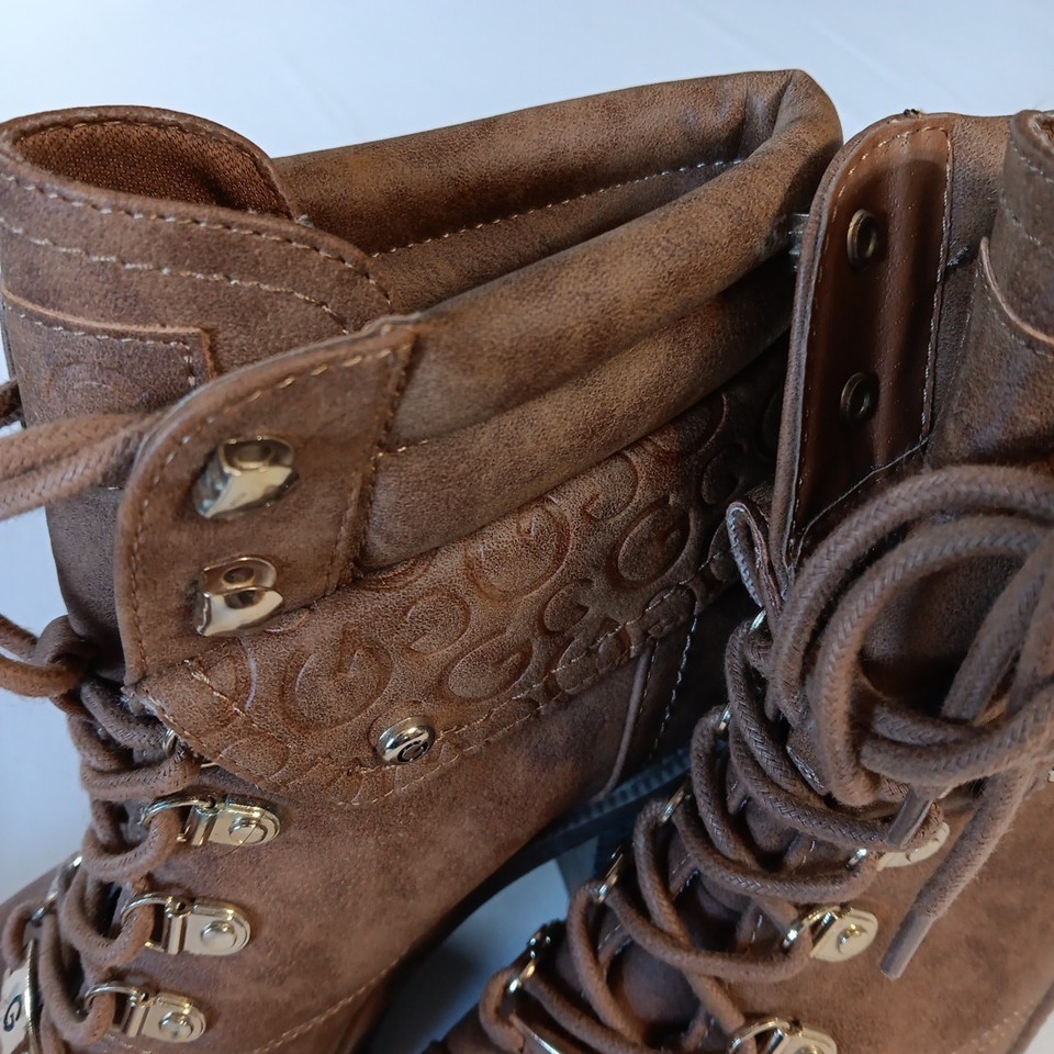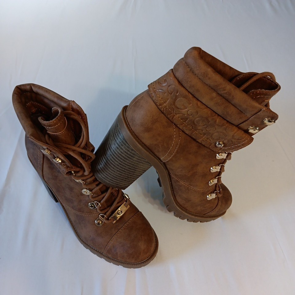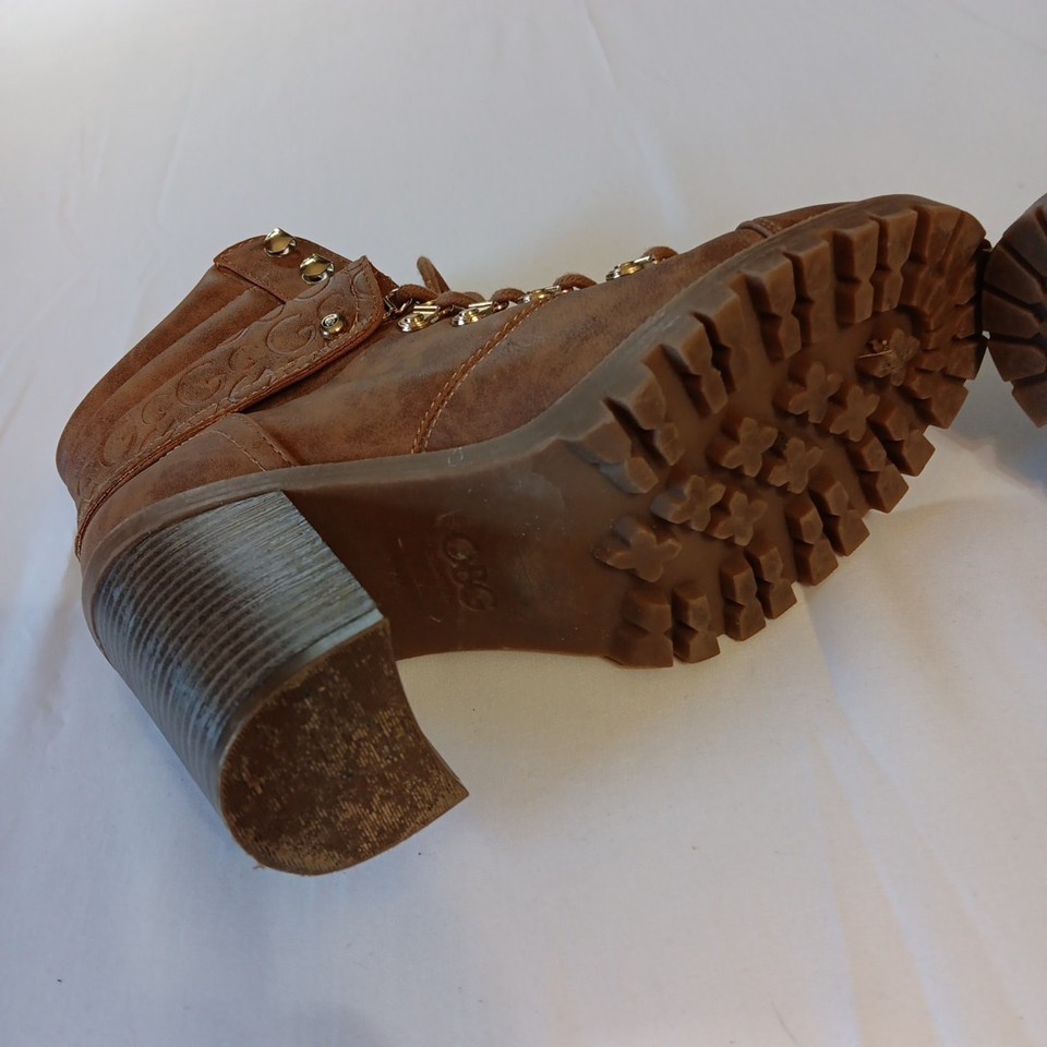 Elevate your shoe collection with these stylish GBG Los Angeles Josine heeled boots. The ankle boots feature a lace-up closure and a chic brown color that complements any outfit. Made from faux leather, these booties are perfect for casual occasions during the summer, fall, or spring seasons. The GBG Los Angeles Josine boots also include a logo feature and an angel theme, adding a touch of elegance to your look. Available in women's size 7M, these booties are a must-have addition to your shoe collection. Dress them up or down for a versatile and fashionable look. Normal wear. See pictures.