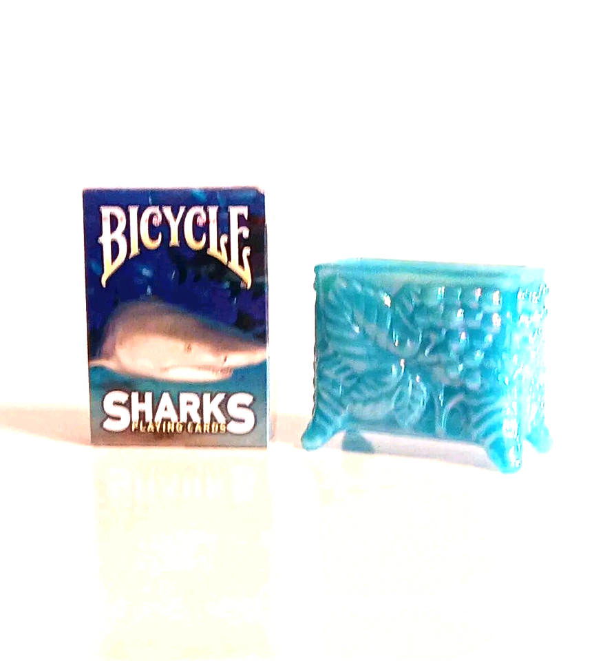 This Boyd Art Glass Grape Card Holder is a unique and exquisite piece of art glass that will add a touch of elegance to any collection. The sky blue color of the glass and the raised grape pattern make it a stunning piece that will catch the eye of anyone who sees it. The holder is designed to hold a deck of cards or a pack of cigarettes, which adds an element of fun and practicality to the piece. The holder is made of high-quality glass and features a production style of art glass. The subject of the piece is the raised grapes.Normal wear. See Pictures NOTE THAT A SEALED DECK OF BICYCLE SHARKS PLAYING CARDS ARE INCLUDED,