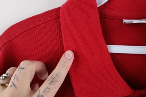 Blemishes front, back, collar. Collar, arms discolored. Loose threads front, right side. Dark spots, pilling. Color faded