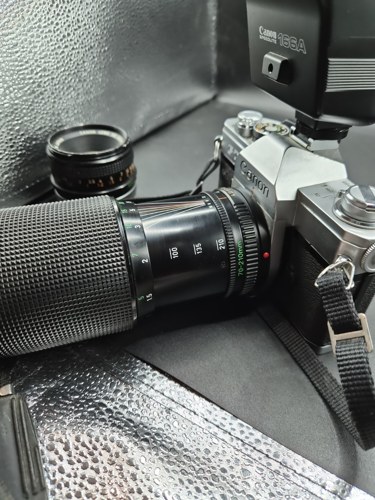 Canon FT QL 35mm Film Camera Kit w/ FD 50mm f/1.8, FD 70โ210mm f/4 Zoom & Speed
