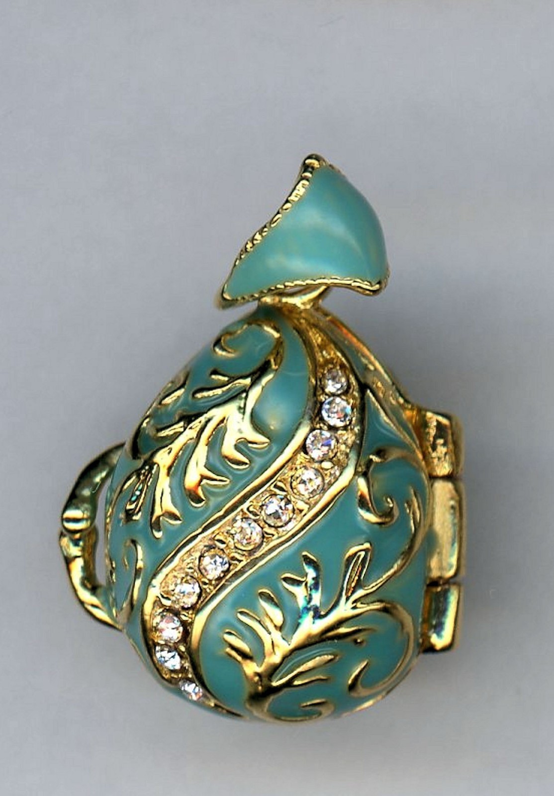 Designed with Crystals embedded in a Gold Leaf feature with Light Blue background. Background is Light Blue, multiple crystal Gold Leaf design, gold banded, and same feature on the reverse. Opens with Angel and her harp. !!! ALL EGG PENDANTS COME WITH FREE SNAKE CHAIN 1.2/2mm 24 INCHES !!! Light Blue background Gold Leaf Royal Russian Egg Pendant with Necklace 20 Inches This exquisite and artistically crafted egg pendant necklace brings elegance and sophistication with simple contrasts of color and texture. Its' charm is inspired from Russian royal egg pendants, and it's ready to complete most outfits! Attention Europe and Asia customers please be aware standard postage can take from 7-45 business days to arrive. If you need the item faster please select another mailing option. Please