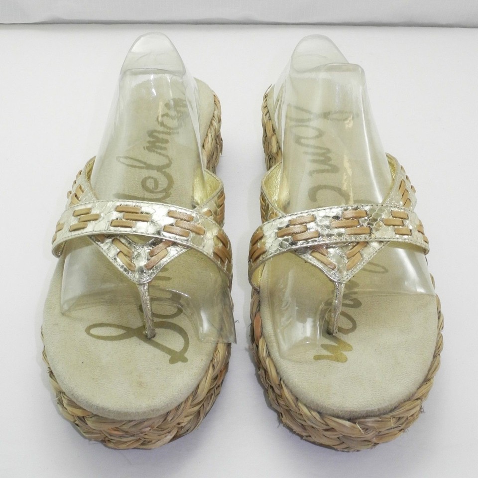 Sam Edelman women's size 10 M sandals. Metallic silver leather and gold ribbon thong strap upper. Platform heel is covered with braided jute and has light wear. Soft suede insole; rubber outsole. Very good condition.