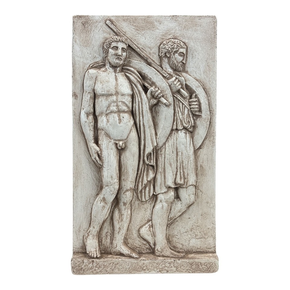 Este hermoso relieve representa a dos antiguos guerreros griegos, símbolos de valentía y honor. Con detalles intrincados, la escena refleja el arte y la fuerza de la escultura griega clasica. Inspirada en la antigüedad, esta replica es perfecta para los amantes del arte clasico y la historia.