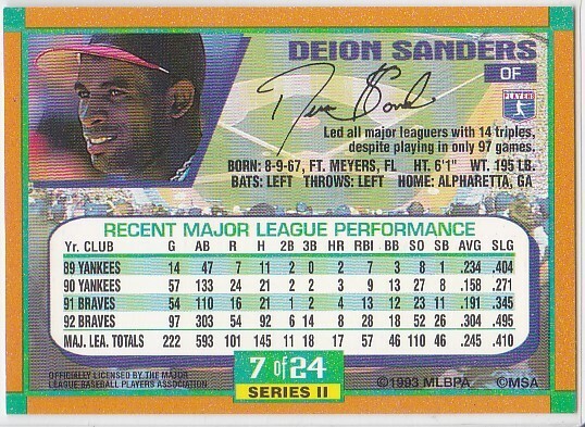 G) 1993 Duracell Series 2 Baseball Trading Card Deion Sanders #7