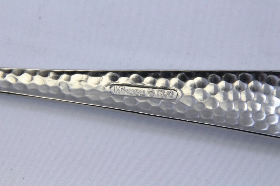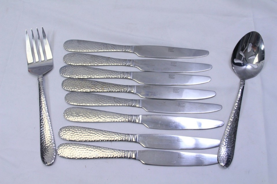 Mikasa Ellyson Hammered 8 Dinner Knives Meat Fork Slotted Serv Spoon Lot of 10