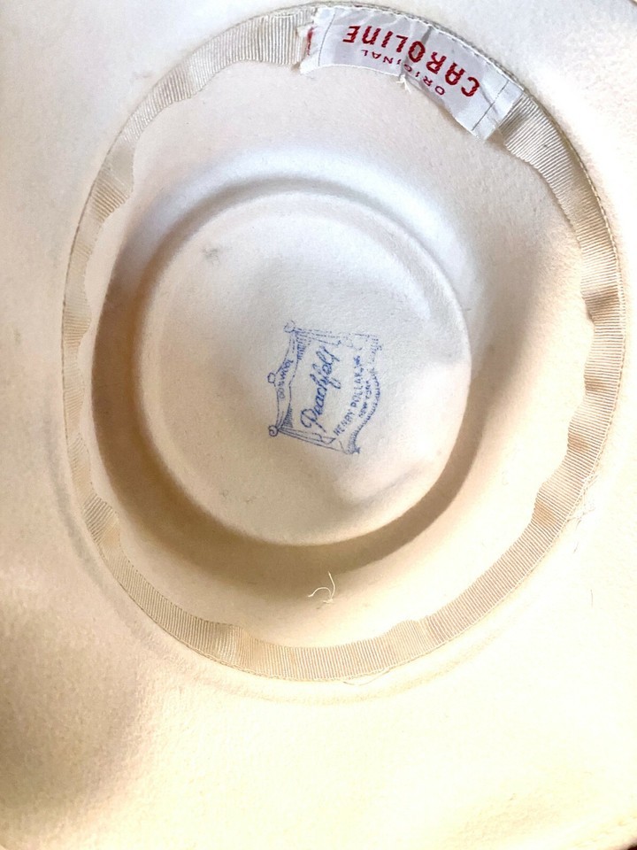 Lovely Caroline Brand bucket hat in ivory wool felt ( Henry Pollack Peachfelt) is in fab condition, clean and ready to wear, no smells- I recommend it highly! One size should fit most. About 21" in circumference.