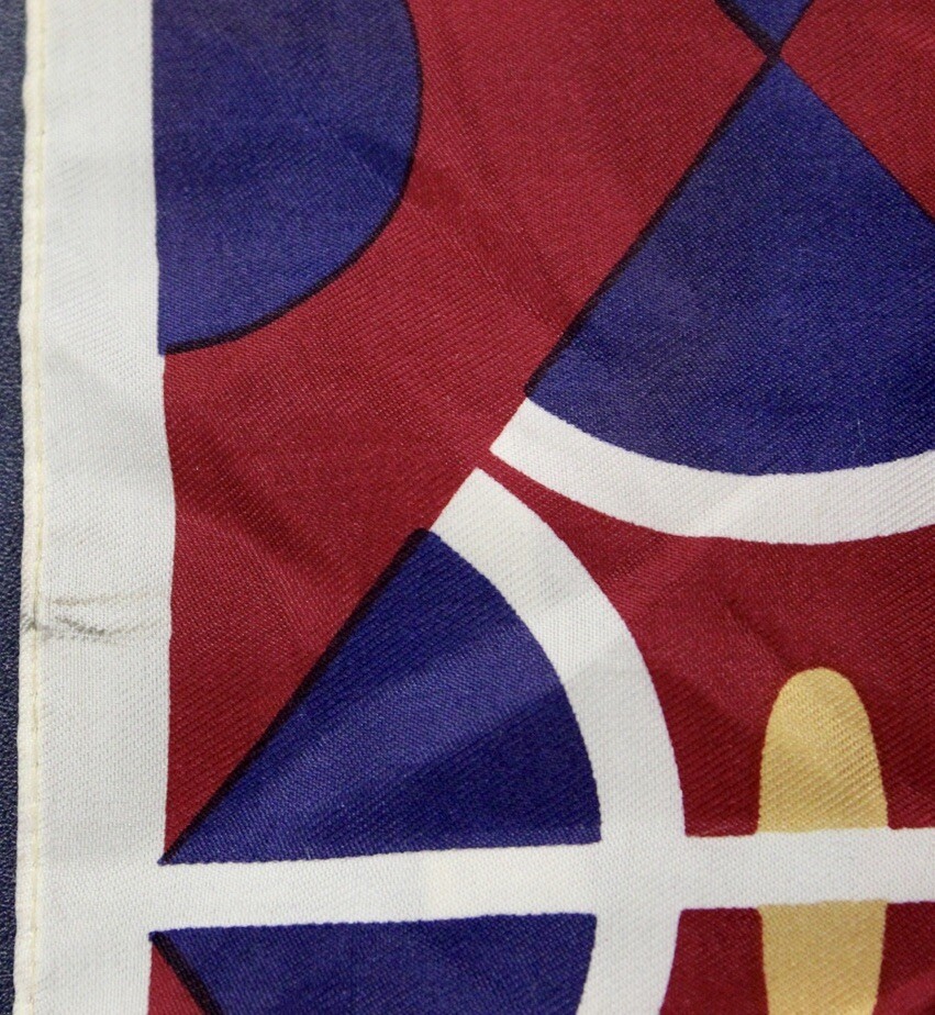 Vintage 1970s-80s Christian Dior Scarf in Wine, blue and gold, Authentic, measures 27" w x 8", made in Italy of Acetate. It has 2 small stains as shown.