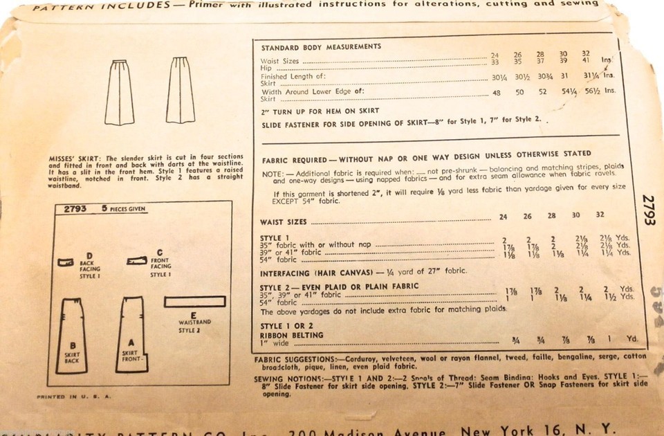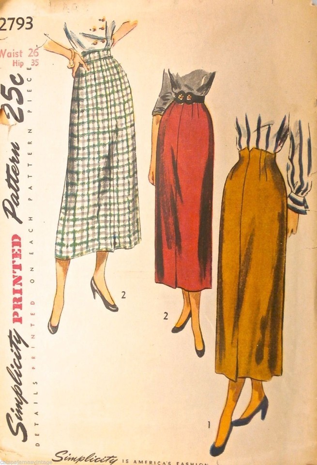 VTG 1940s Sewing Pattern Simplicity #2793 Slim Pencil Skirt Waist 26 Hip 35