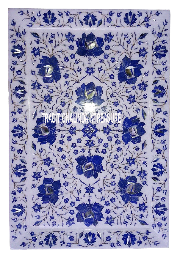12"x18" White Marble Tray Plate Genuine Lapis Lazuli Inlaid Art...- show orig...