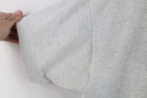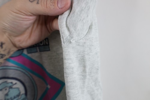 Loose thread left armpit. Stain back bottom. Dark spots, pilling. Graphics cracking/faded. Color faded. Made in USA