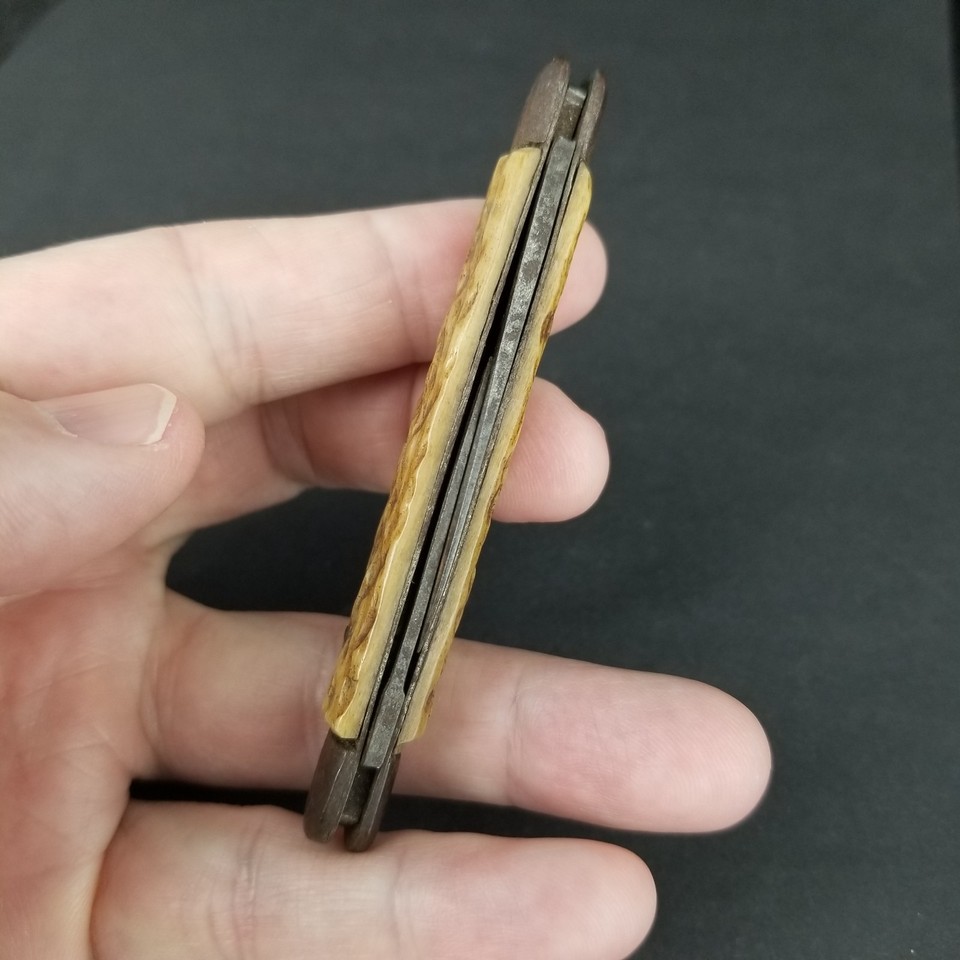 3 1/2" long when closed. No cracks of chips in either handle. Open and closed as it should. Some snap on larger blade and none on smaller. Signs of age as it is very old. SEE PICTURES.