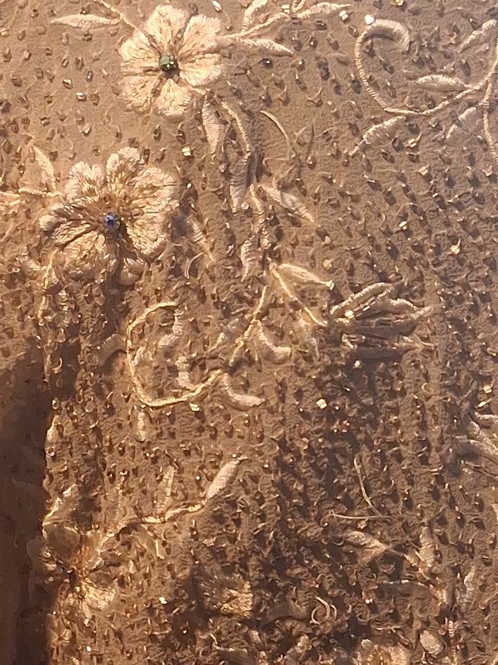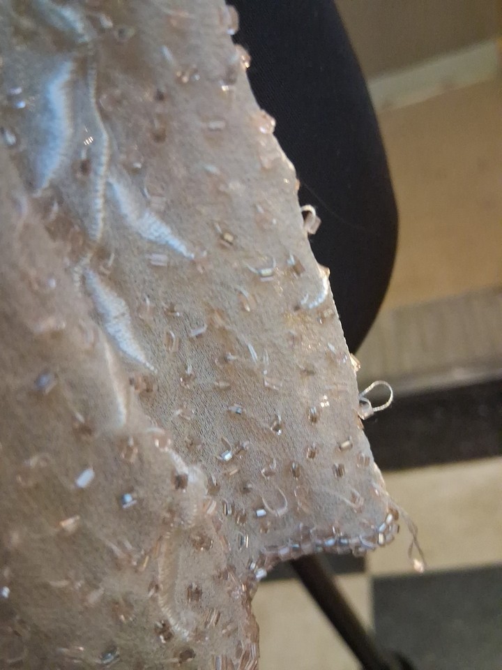 This beaded silk jacket is perfect for a formal occasion such as a wedding or cocktail party. The floral pattern, rhinestone accents, and intricate beadwork give it a classic and elegant look. The beige color is sophisticated and versatile, suitable for any season. With its long sleeves and collarless design, this jacket adds a touch of elegance to any outfit, making it a must-have for any fashion-forward woman's wardrobe.